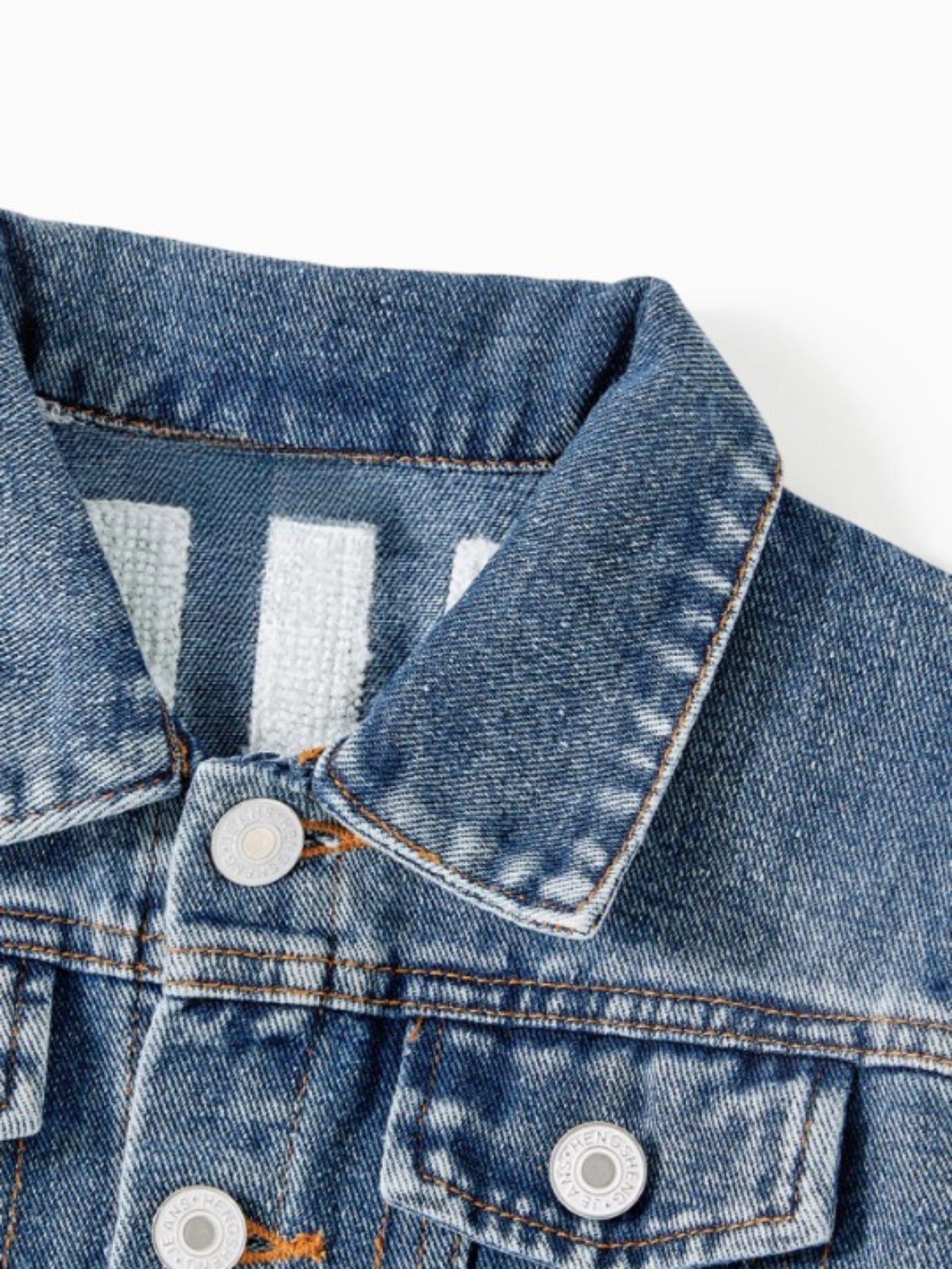 Special Features: Includes classic elements such as button closures, flap pockets, and a pointed collar for a traditional denim jacket look.