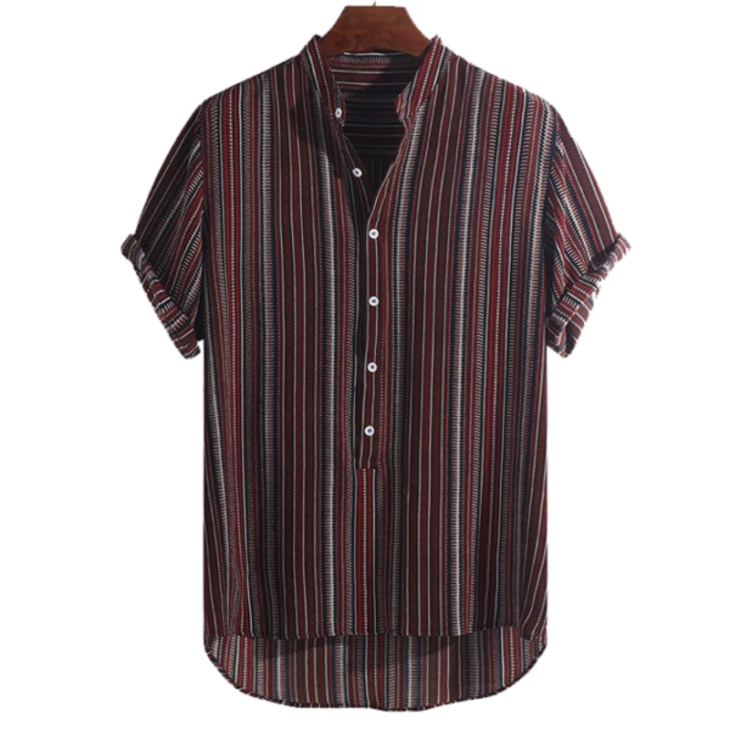 Ethnic style stripes bring pattern and movement to a short sleeve, loose henley shirt. Stand apart in the crowd in this polyester wear with stand collar and button closure.