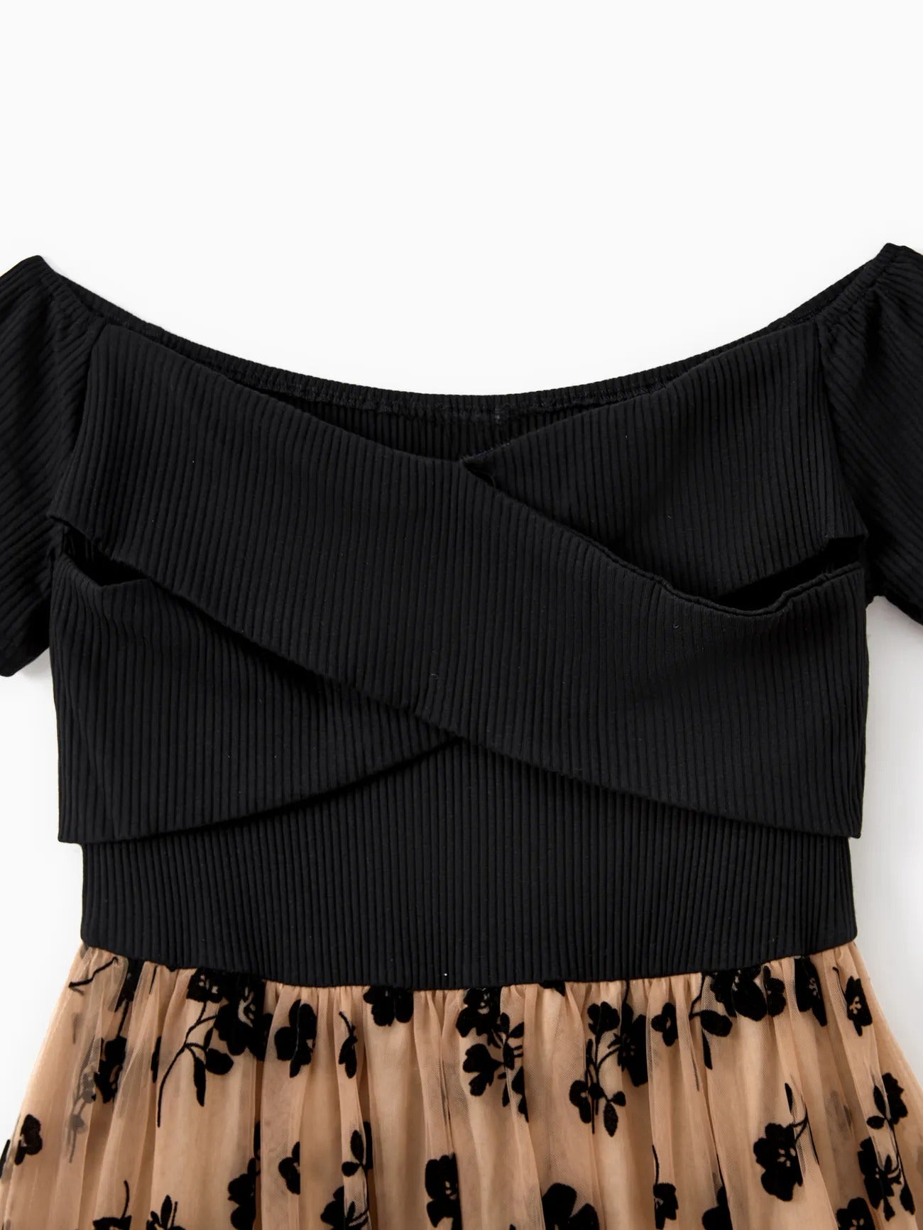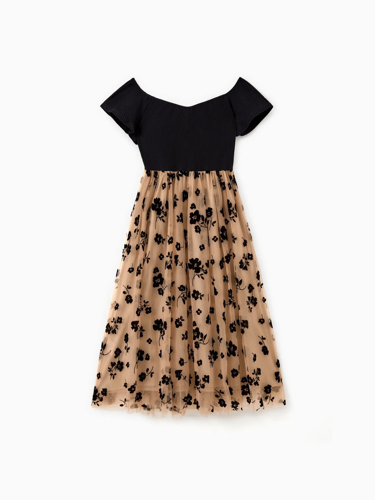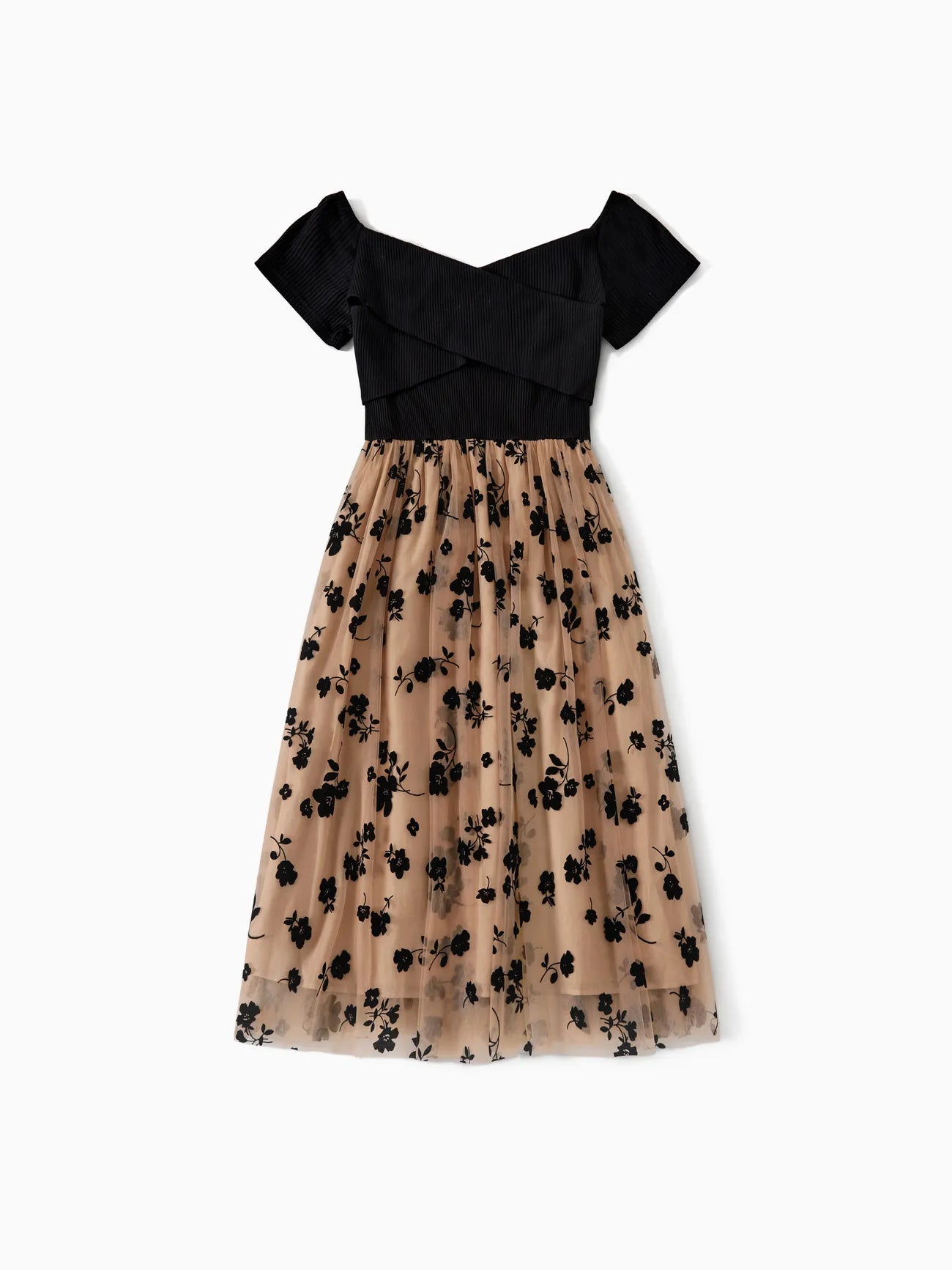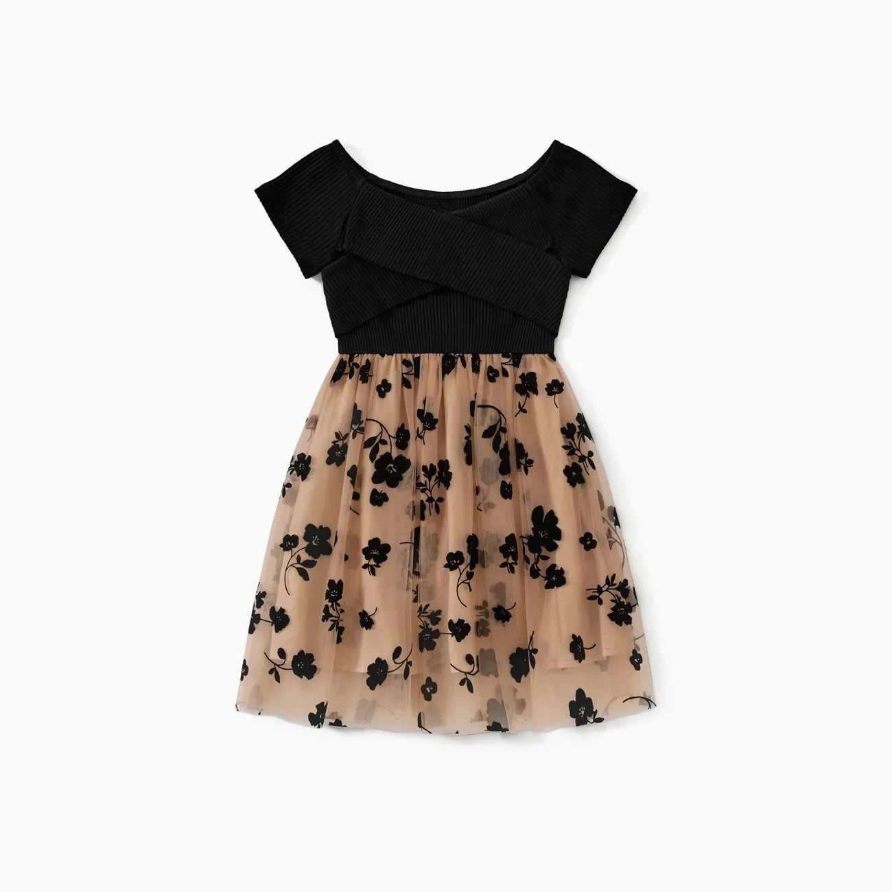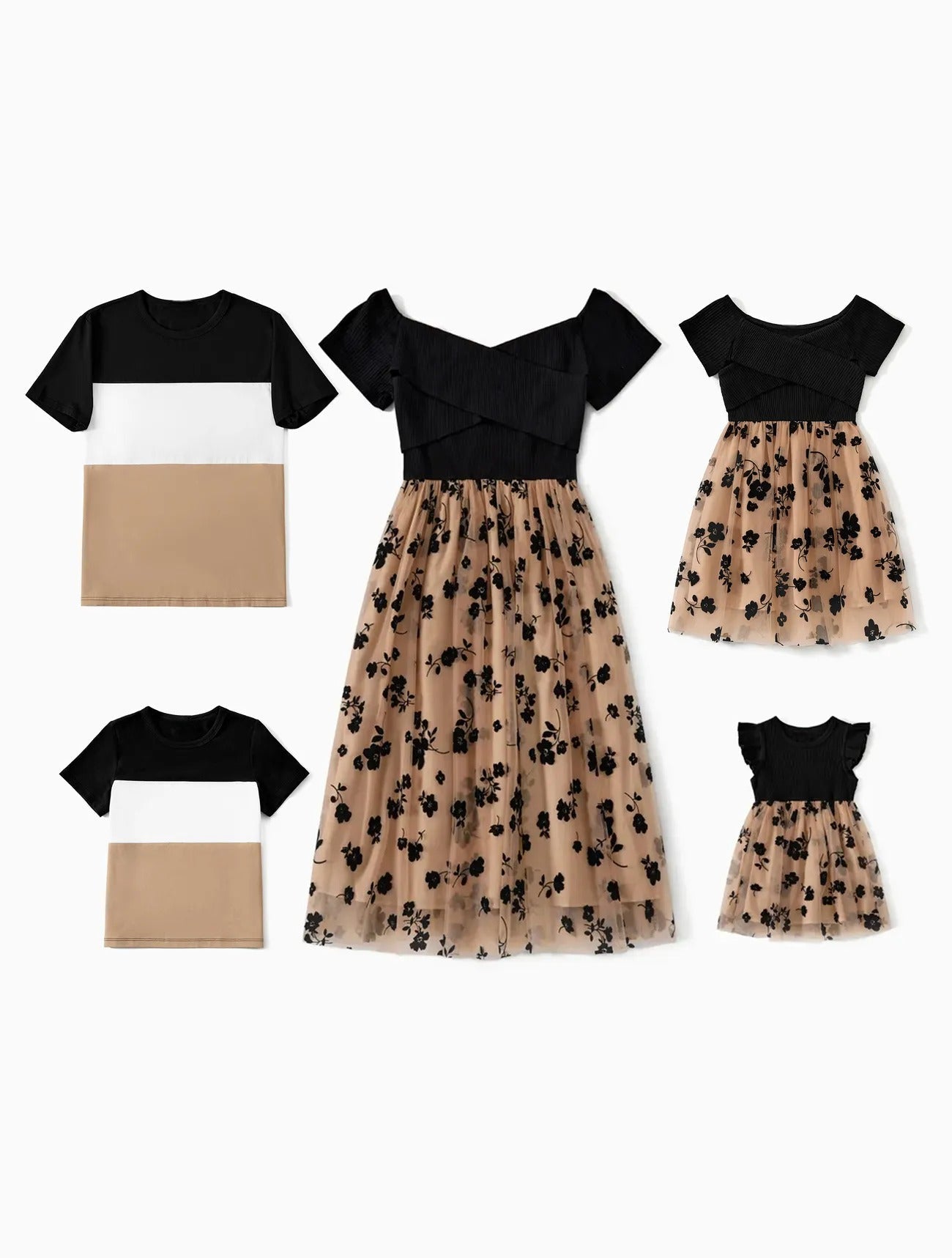 Achieve a coordinated and stylish family look with these floral-print mesh dresses and color-block short-sleeved tops. Designed for both elegance and comfort, these outfits are ideal for family gatherings and special occasions.