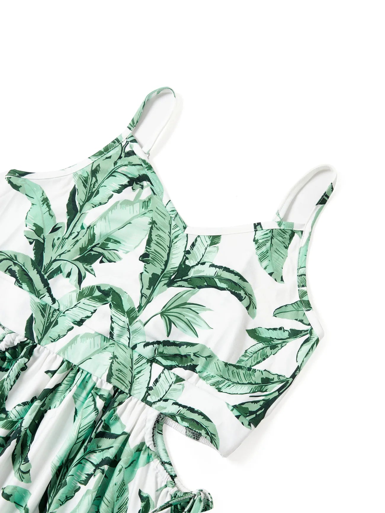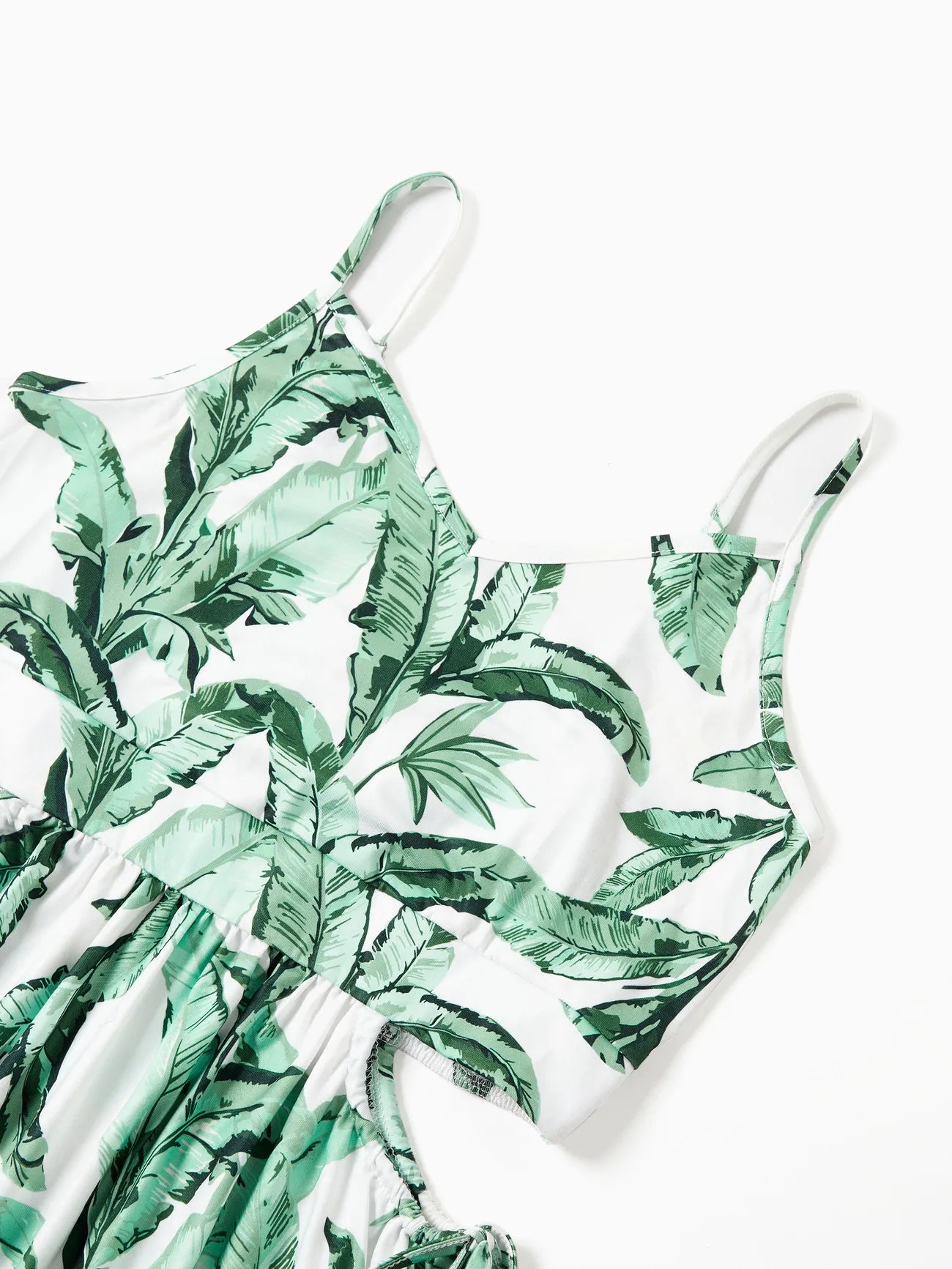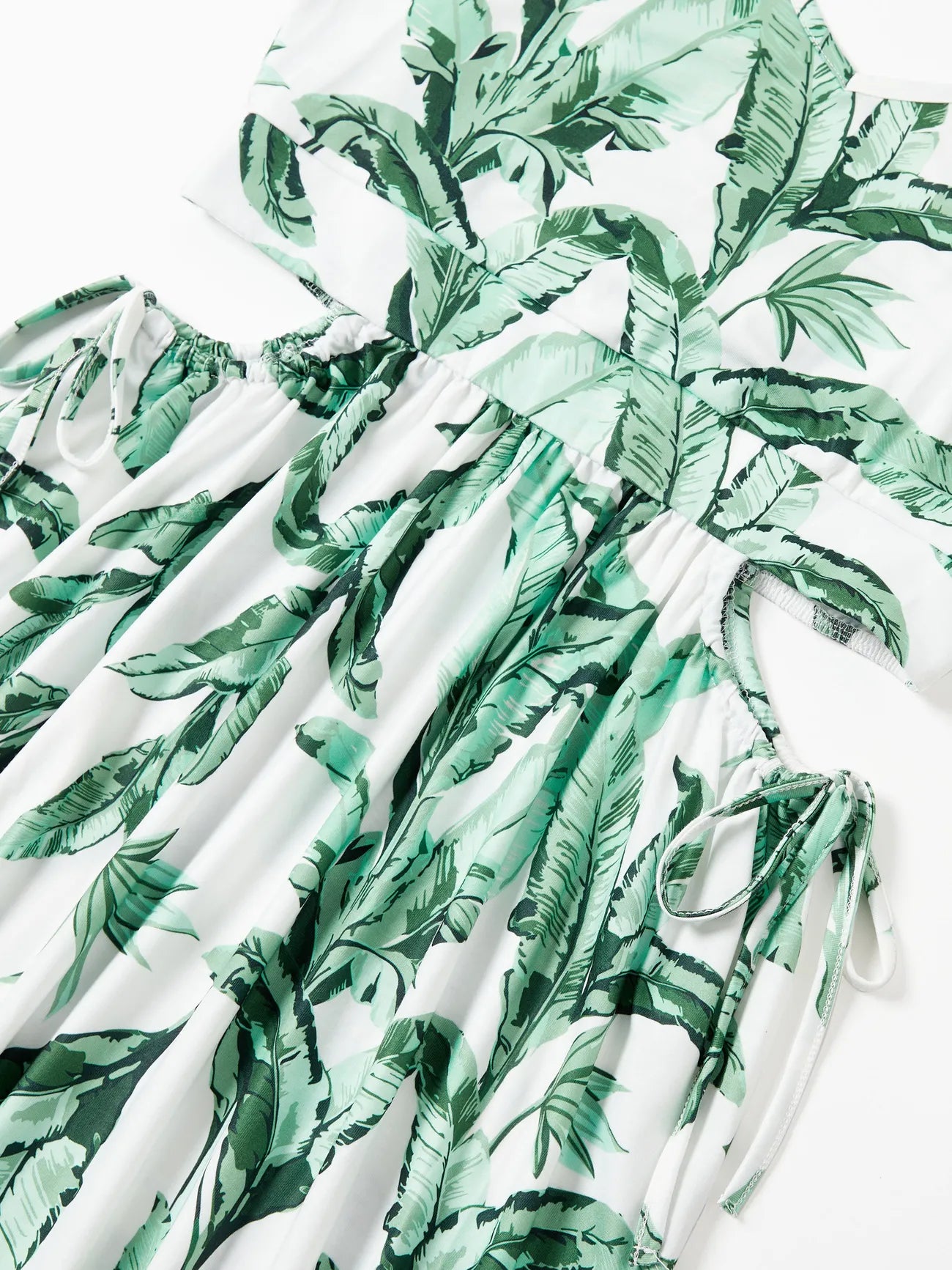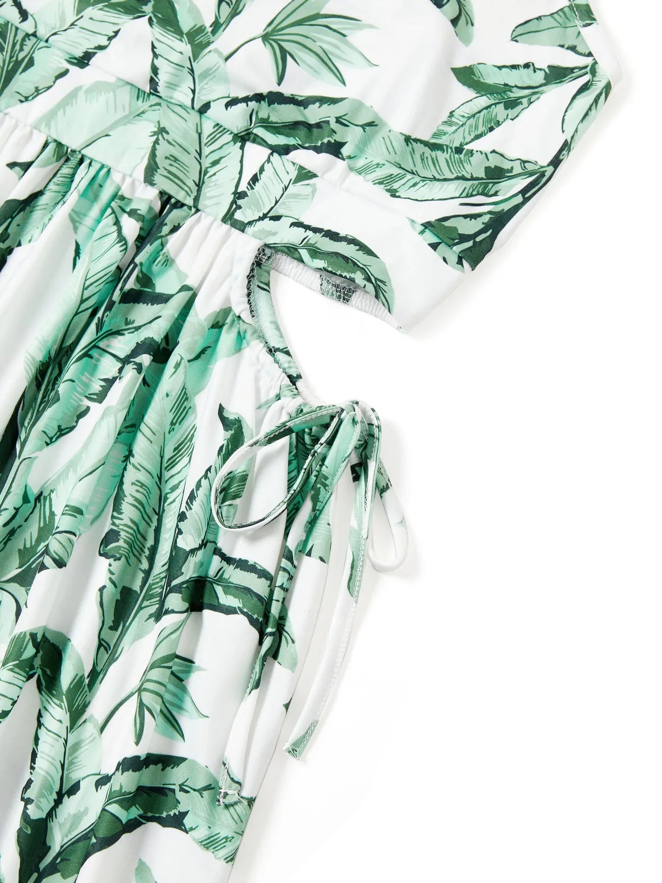 Design Elements: The tees feature a vibrant color-block pattern, while the dresses boast a lively green leaf print with playful cut-outs at the midriff, enhanced with adjustable drawstrings.