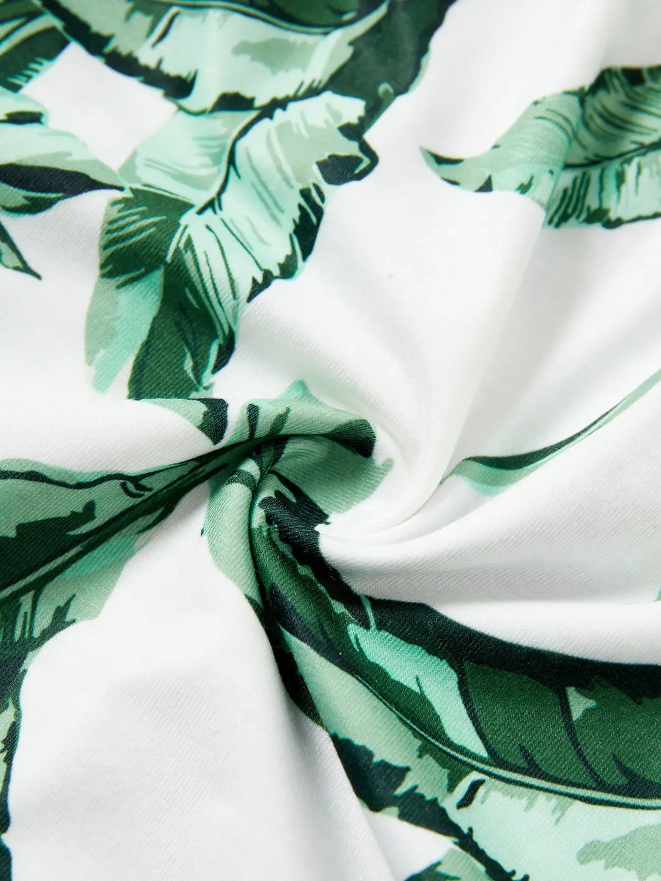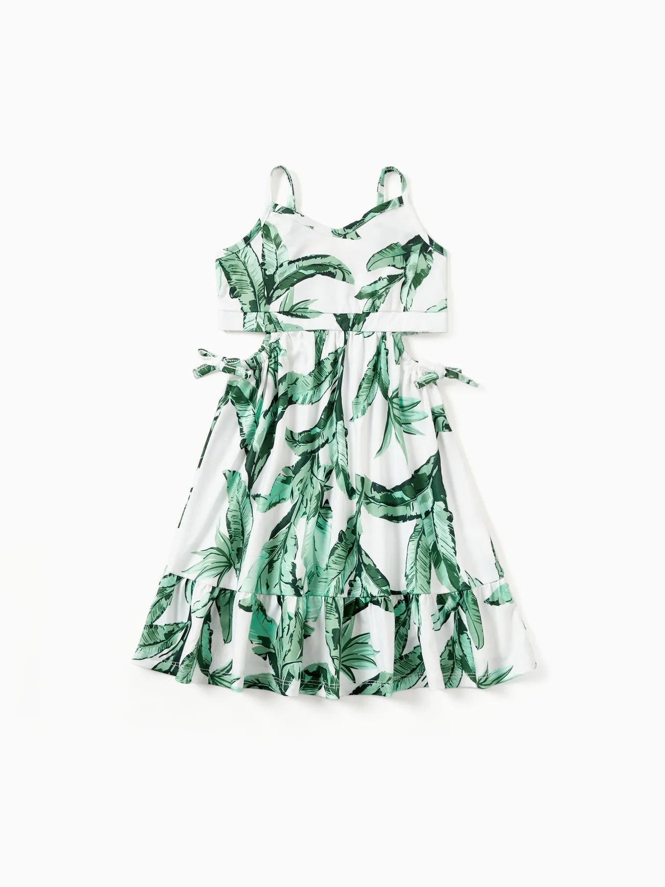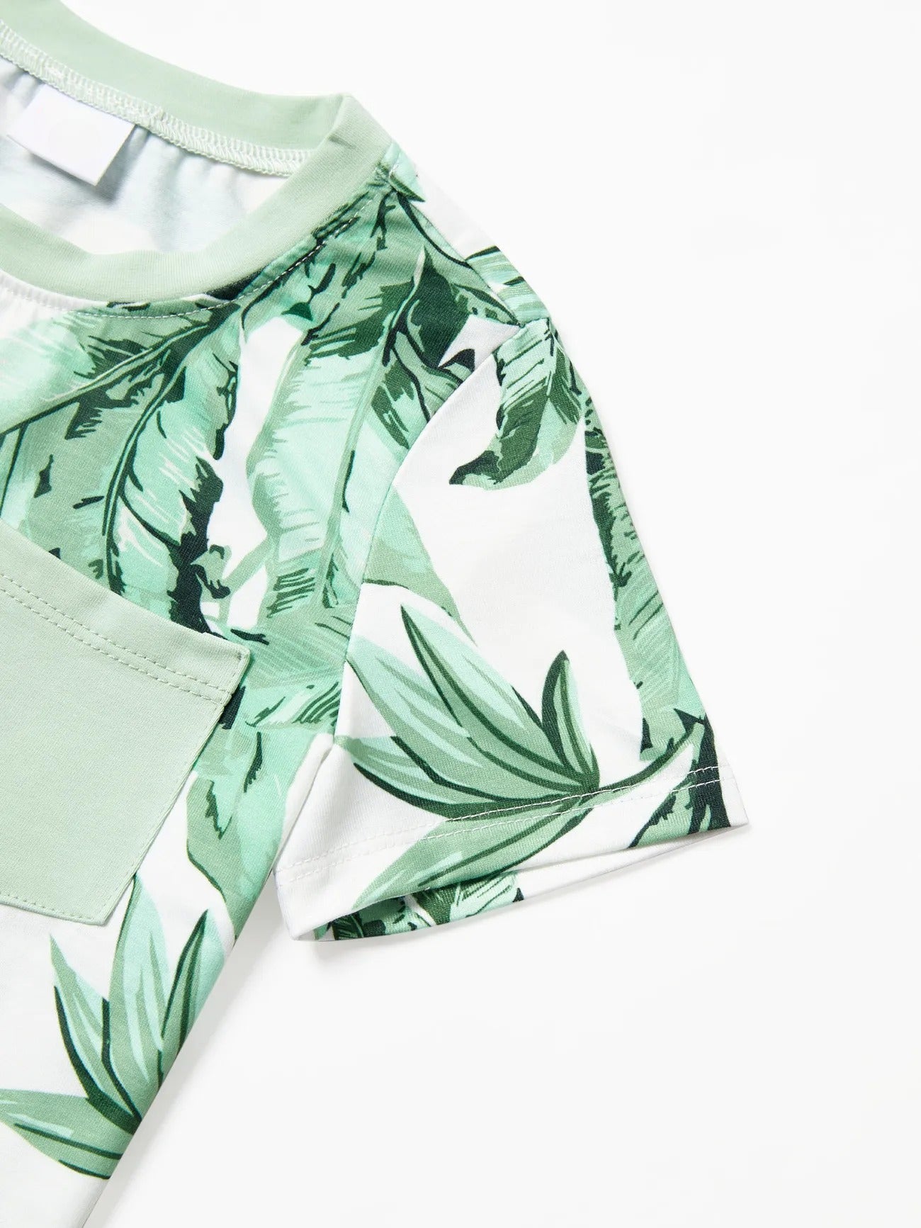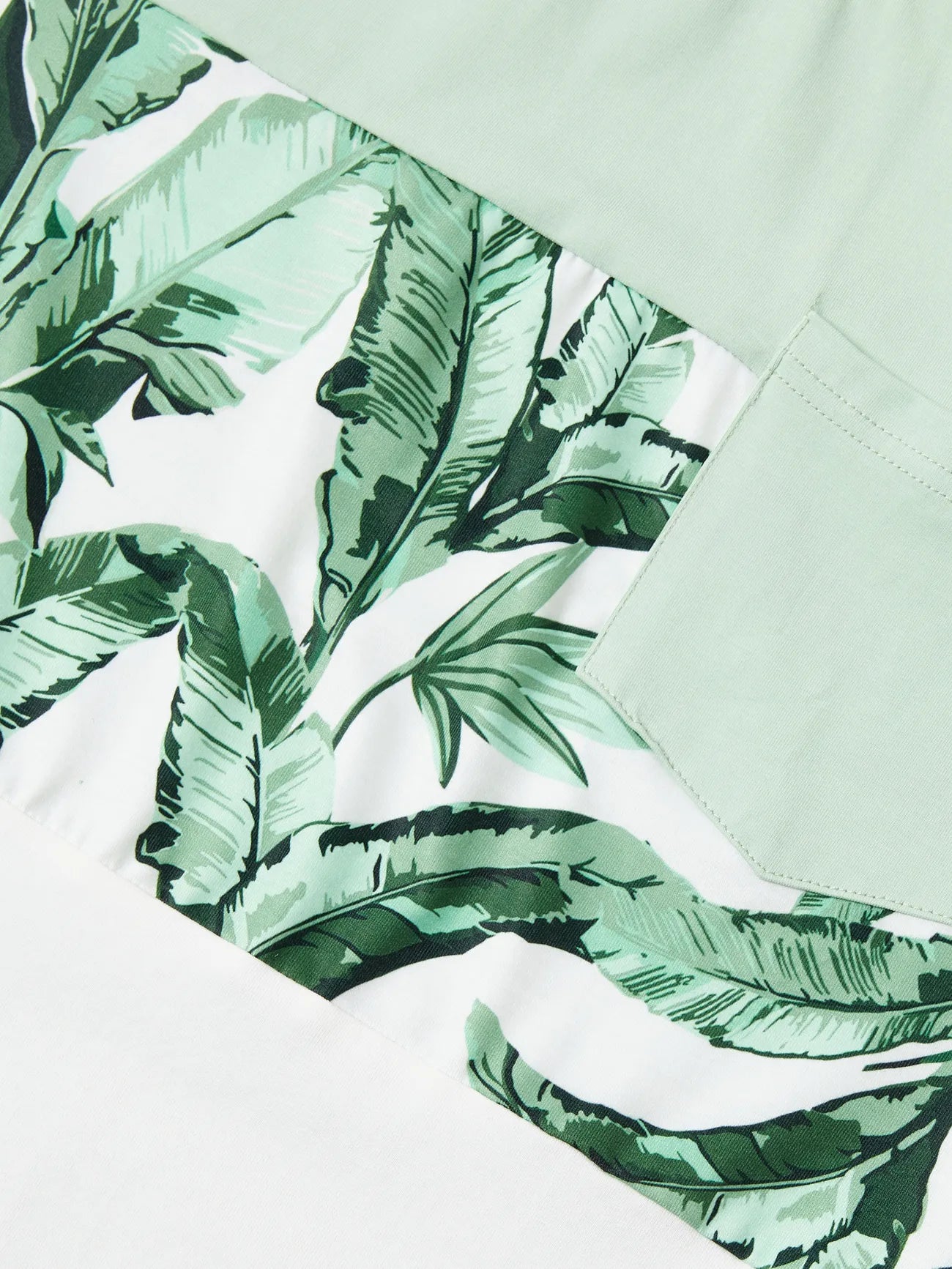 Design Elements: The tees feature a vibrant color-block pattern, while the dresses boast a lively green leaf print with playful cut-outs at the midriff, enhanced with adjustable drawstrings.