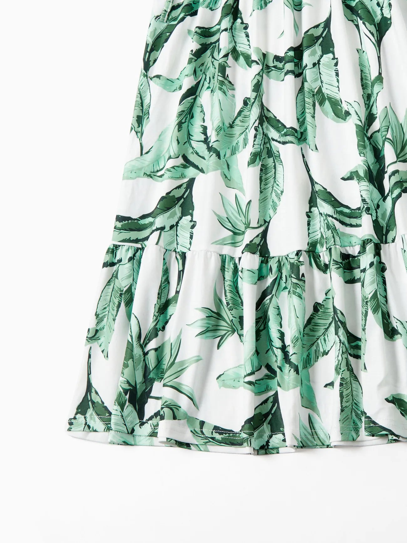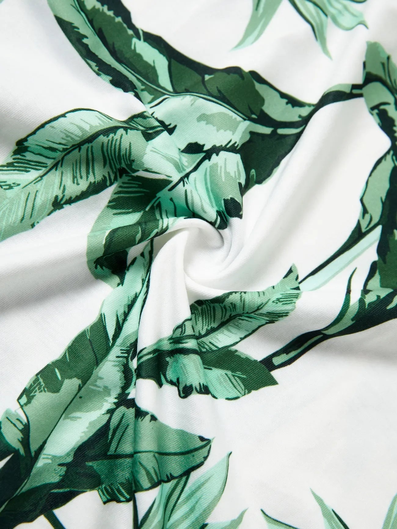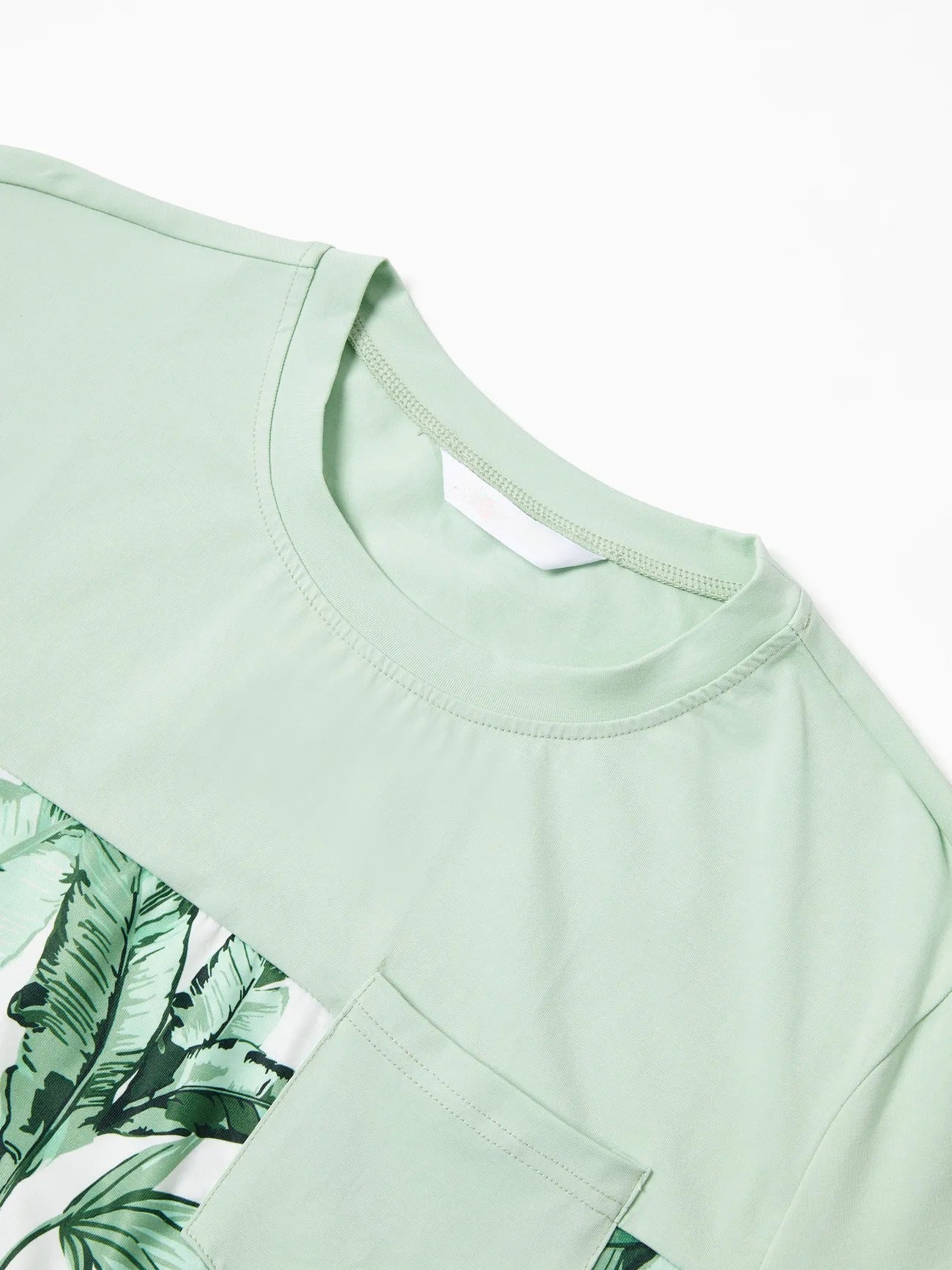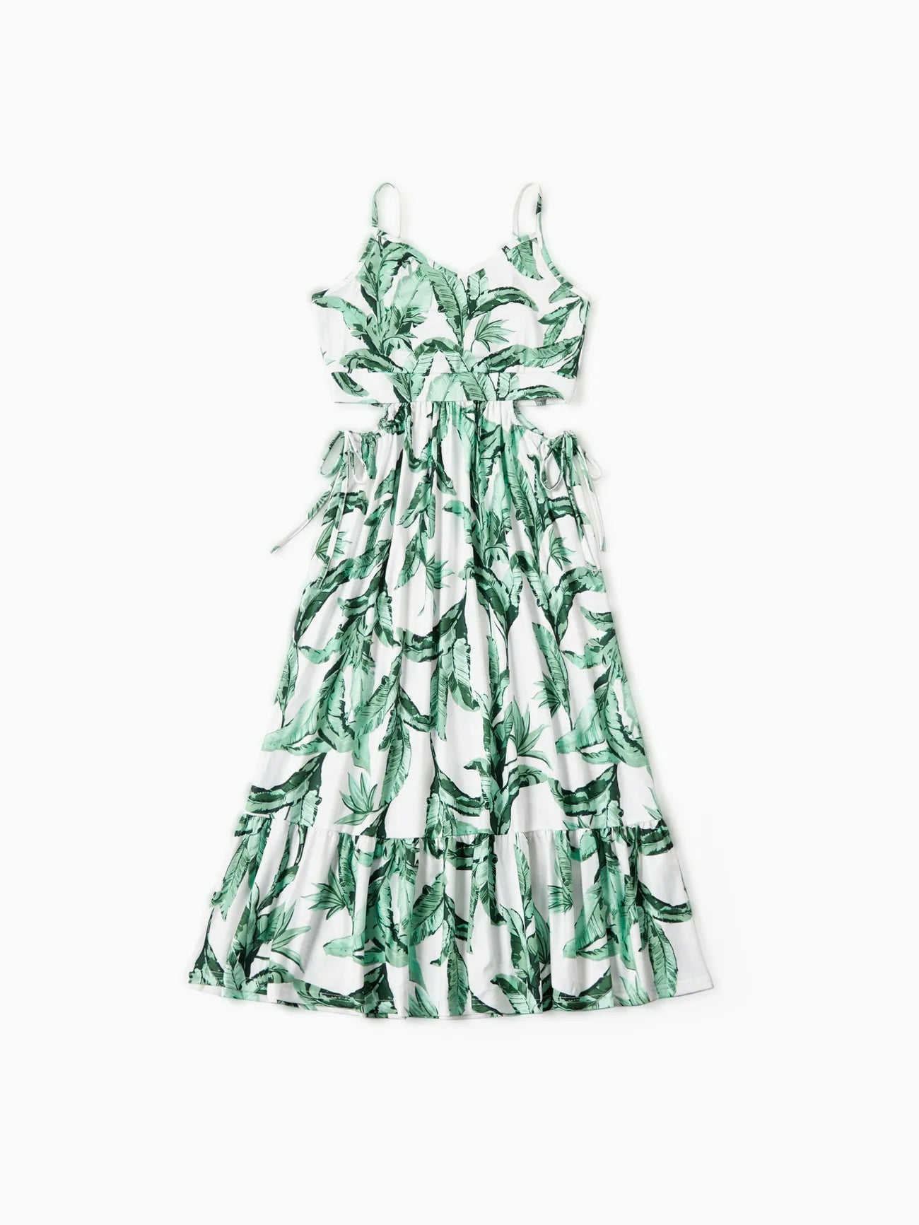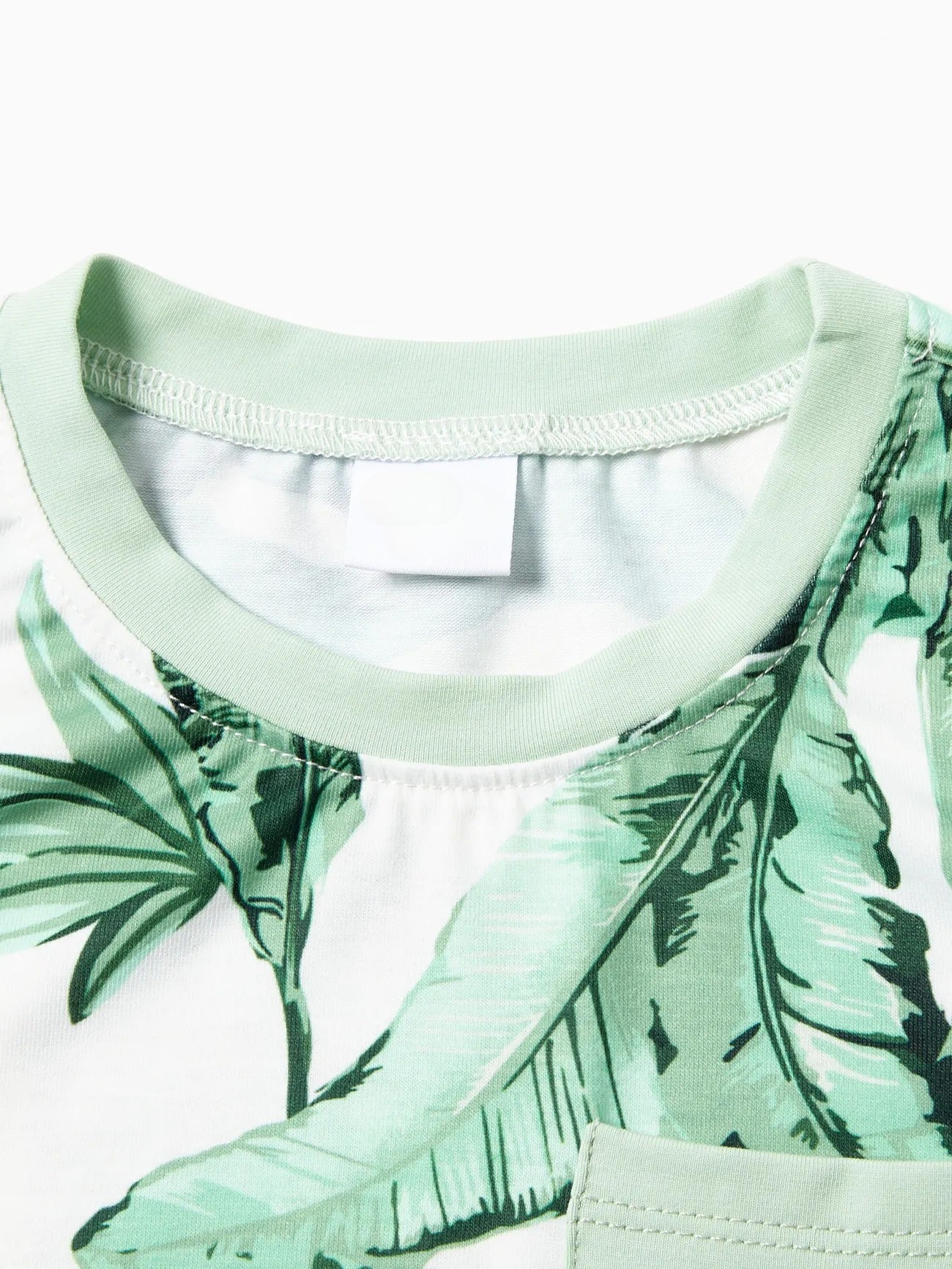 Design Elements: The tees feature a vibrant color-block pattern, while the dresses boast a lively green leaf print with playful cut-outs at the midriff, enhanced with adjustable drawstrings.