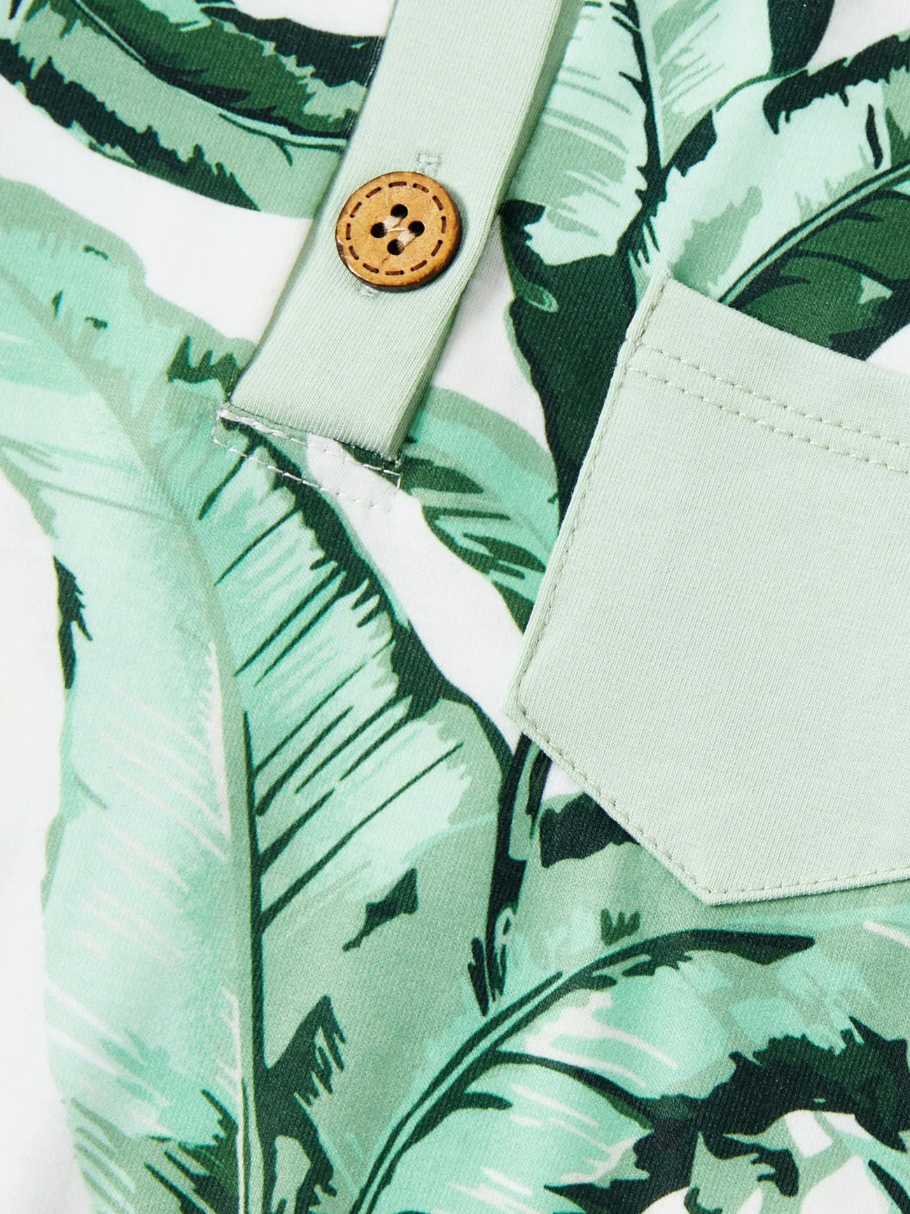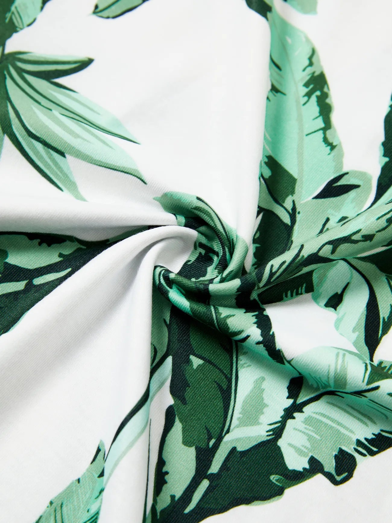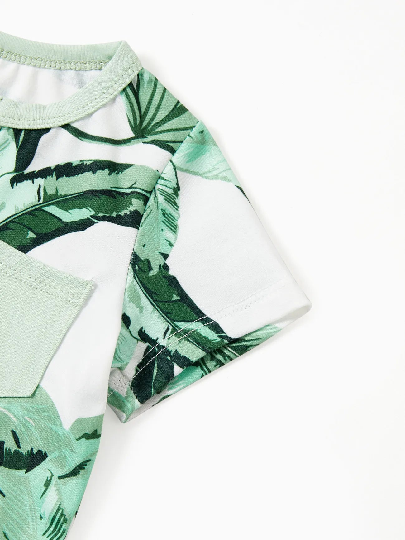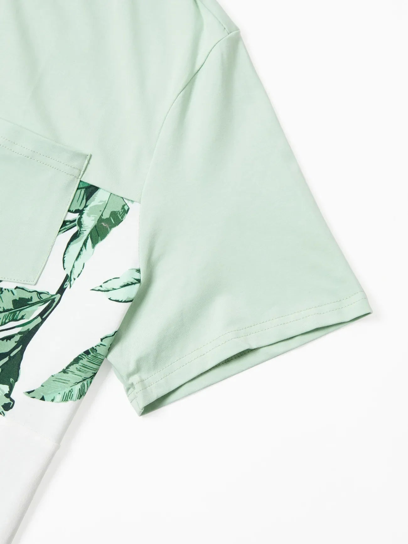 Design Elements: The tees feature a vibrant color-block pattern, while the dresses boast a lively green leaf print with playful cut-outs at the midriff, enhanced with adjustable drawstrings.