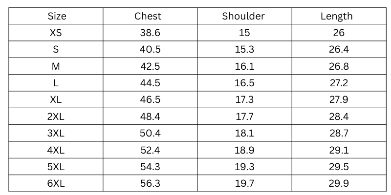 Size Chart(inches):
