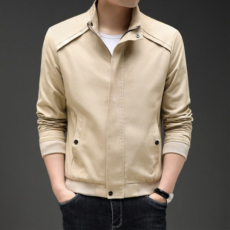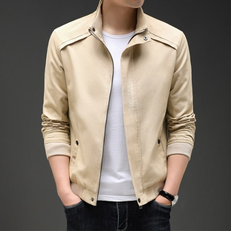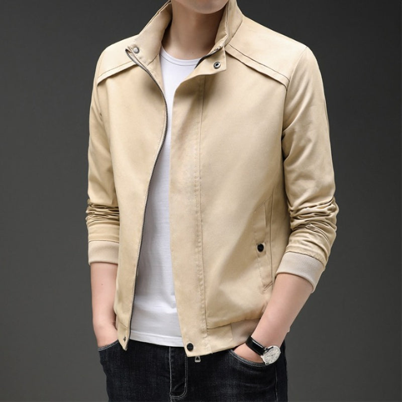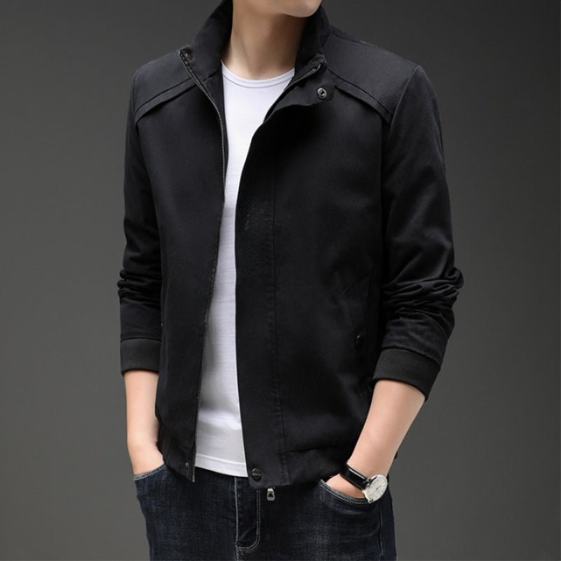 The Men's Casual Stand Collar Bomber Jacket is made of cotton and viscose. It features a conventional cuff style and a stand collar which gives it a simple but classy appearance. The jacket has a regular clothing length and a zipper.