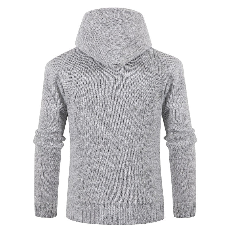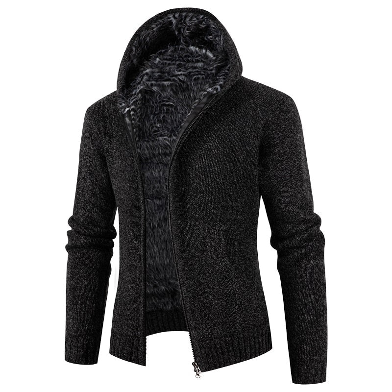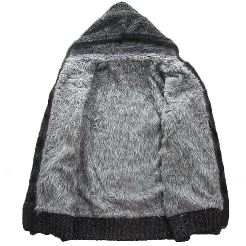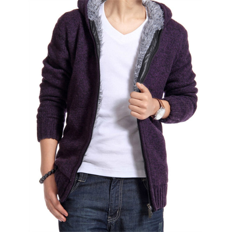 The Men's Knitted Fur Cardigan Jacket has a solid pattern type and a turn down collar. This cardigan is filled with that masculine vibe. It has a very bold color and a fleece thickness. You can wear it anywhere. It has a regular sleeve style and a hoodie attached to it.