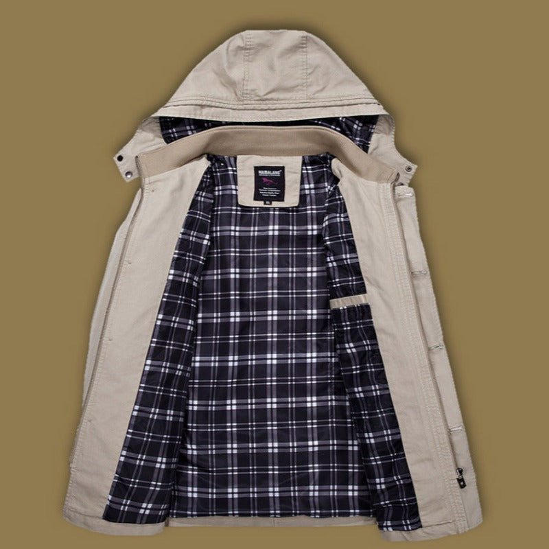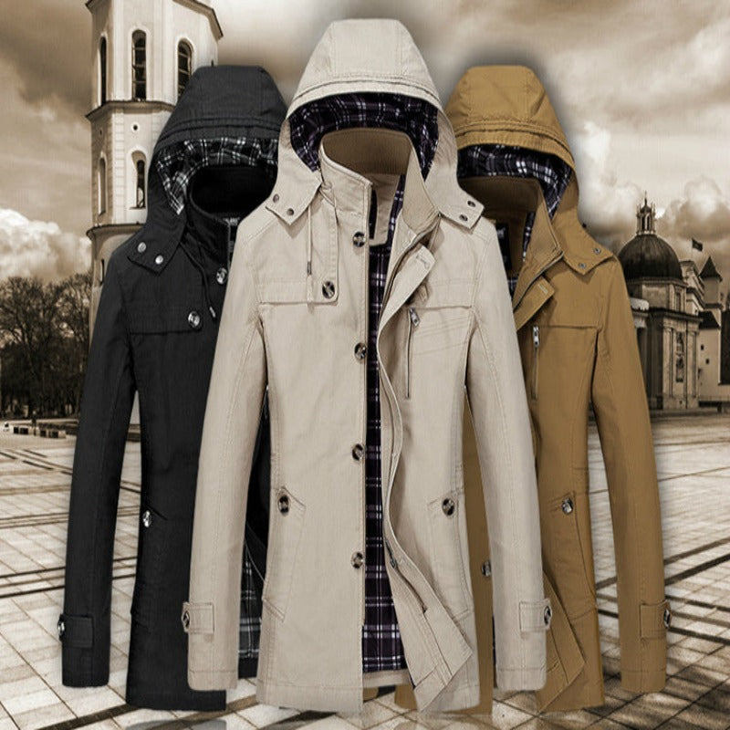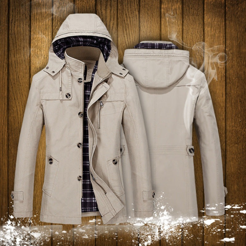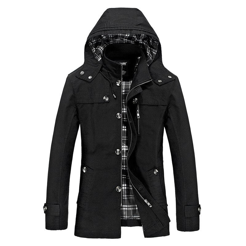 Men's Large Size Hooded Trench Coat is a stylish and comfortable men's long trench coat. Its detachable hat is also included for better protection from the cold. The mix of cotton and polyester offers a soft touch to this jacket that is great for chilly nights in autumn or cool spring mornings.