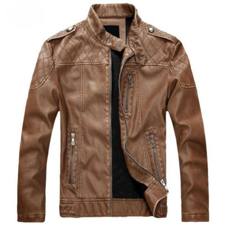 Men's Leather Biker Jacket is made of PU material and can be used as a daily wear jacket. The standard thickness of the jacket makes the jacket warm enough to be worn in the winter season. The rivet decoration makes you ready to go on the road. It also features a mandarin collar and a solid pattern.