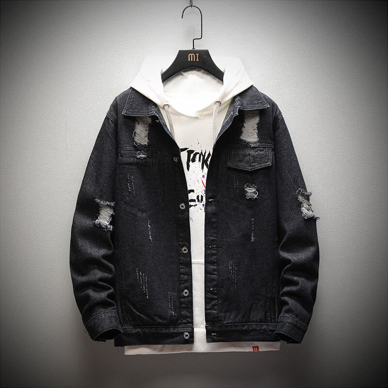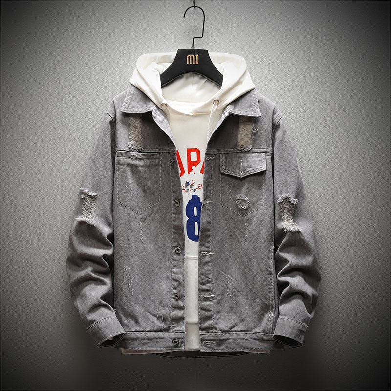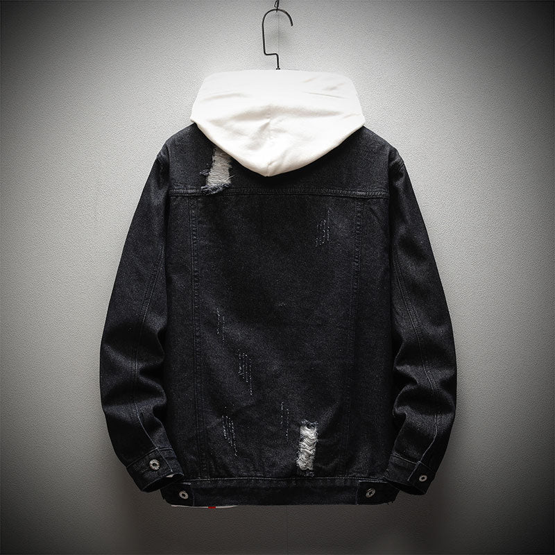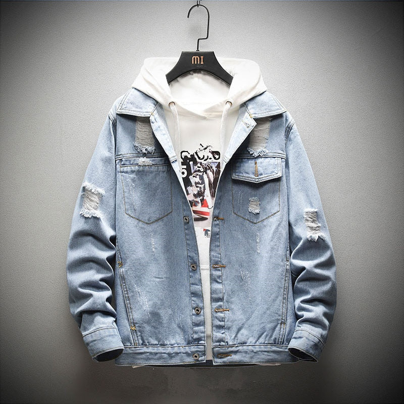 Men's Solid Loose Hooded Denim Jacket follows the ripped fashion and is way cooler. The jacket is wide waisted and has a solid pattern. It features a conventional cuff style and is made of cotton and polyester. This denim jacket has a standard thickness which makes it ideal for seasons like spring and autumn.