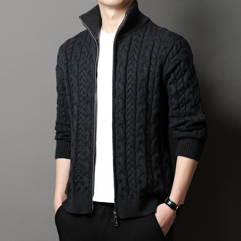 Add this cardigan to your outfit and improve your style. The Men's Stand Collar Zipper Cardigan Sweater collection is like an overcoat that adds a special touch to your personality. It is made of polyester and acrylic. This collection has a mandarin collar and is computer knitted with standard wool. It is available in 2 colors with five different size options.