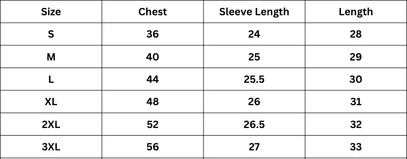 Size Chart (Inches):