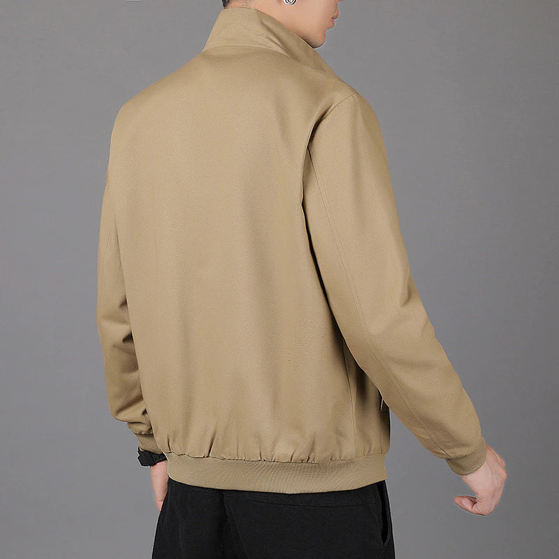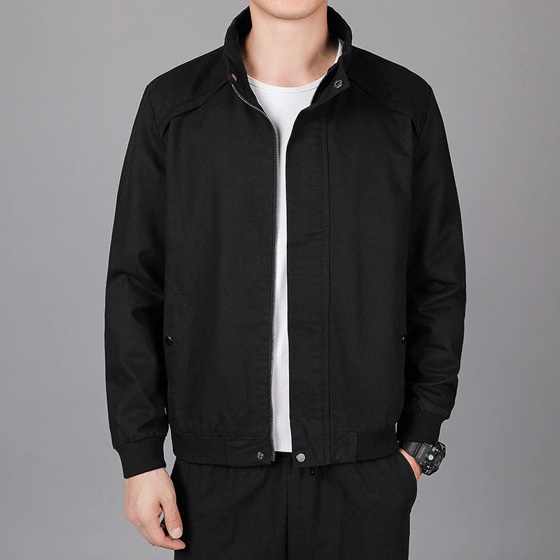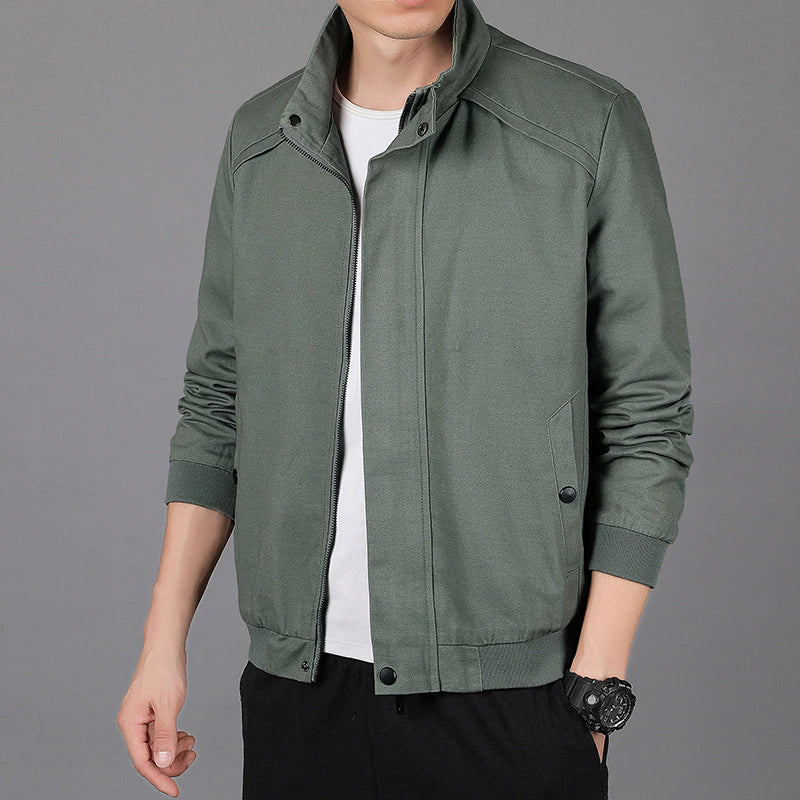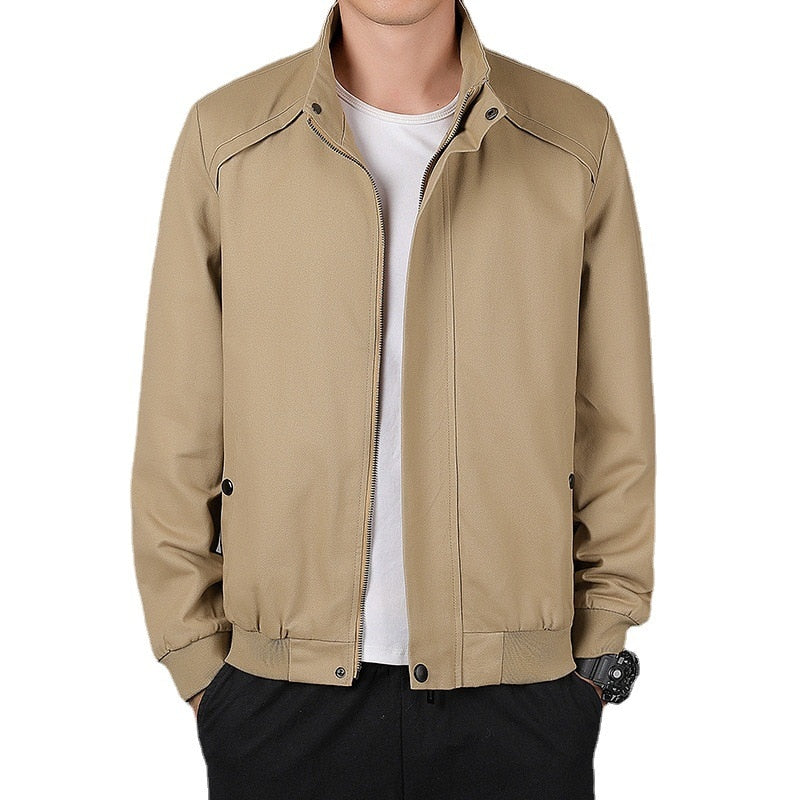 The Stand Collar Men's Outerwear Spring Autumn Jacket is made of cotton and polyester. It can be worn daily with anything of your choice. It comes with a zipper and has a regular clothing length. You can wear it to any kind of outing and look good.