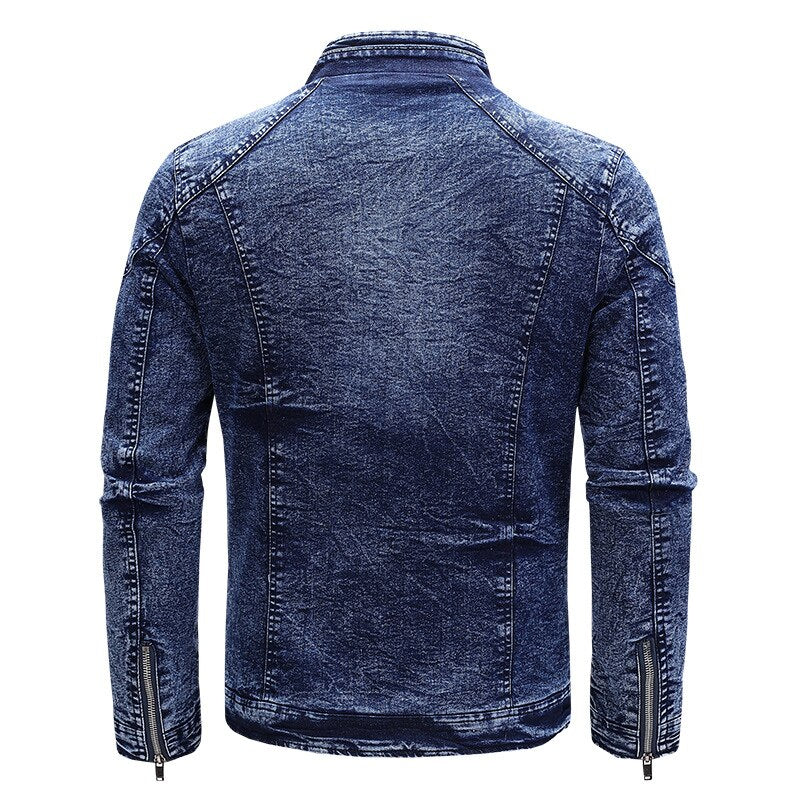 Introducing our newest denim jacket that is perfect for the stylish man on the go. The Stand Collar Slim Fit Denim Jacket is made with a lightweight denim fabric that is comfortable to wear all day long. The details give this jacket an edgy look that will make you stand out from the rest. The zippered closure and pockets make this jacket practical as well as fashionable. Whether you're wearing it for a night out or just running errands, this jacket is a must-have in your wardrobe.