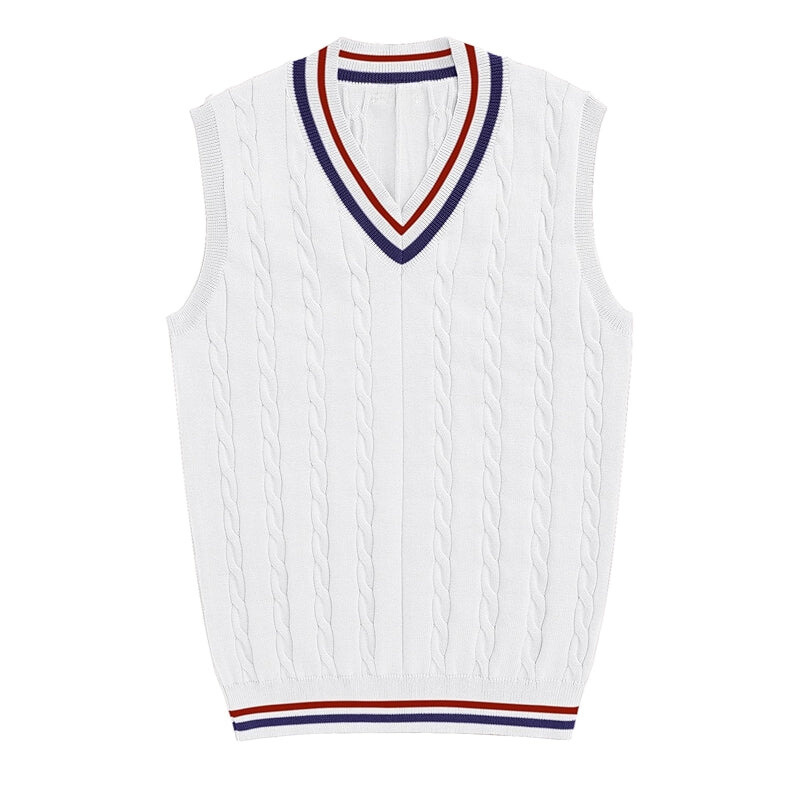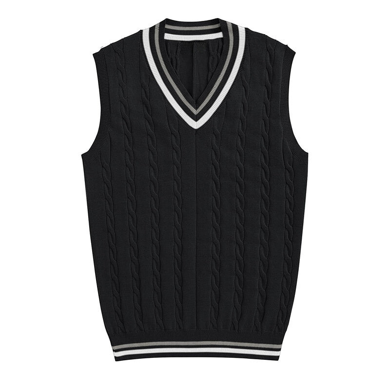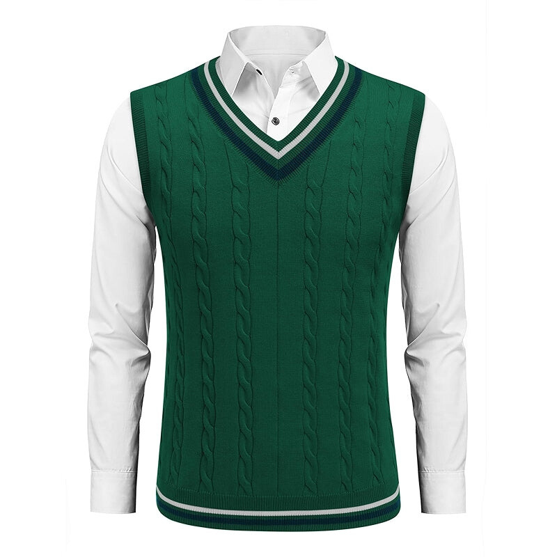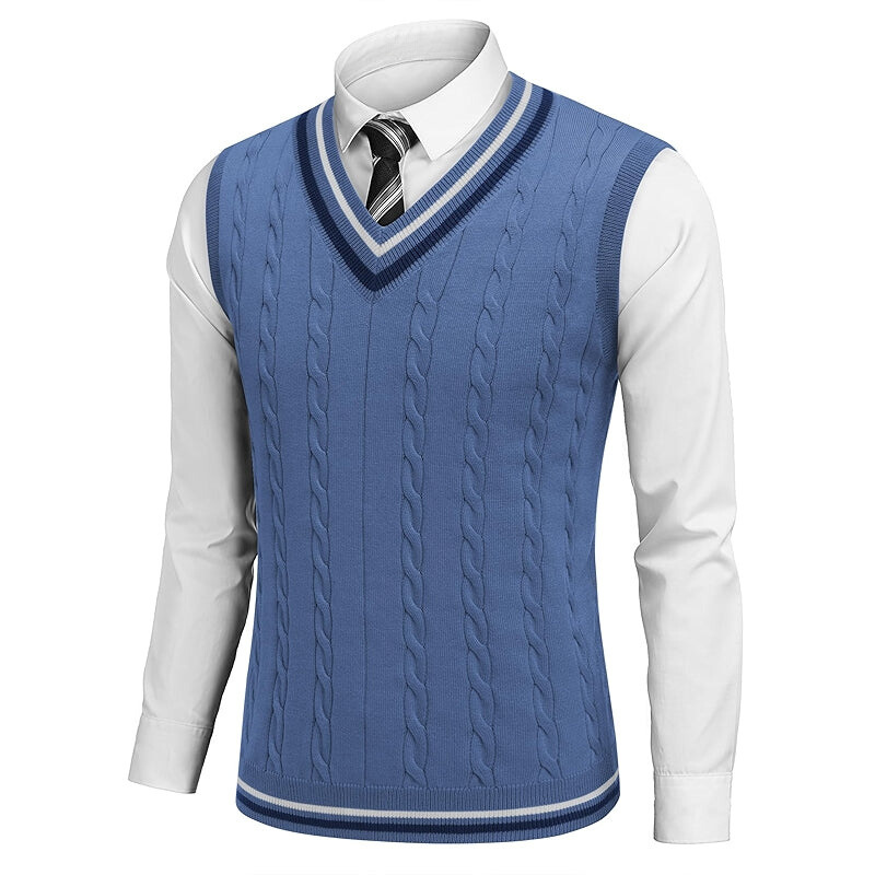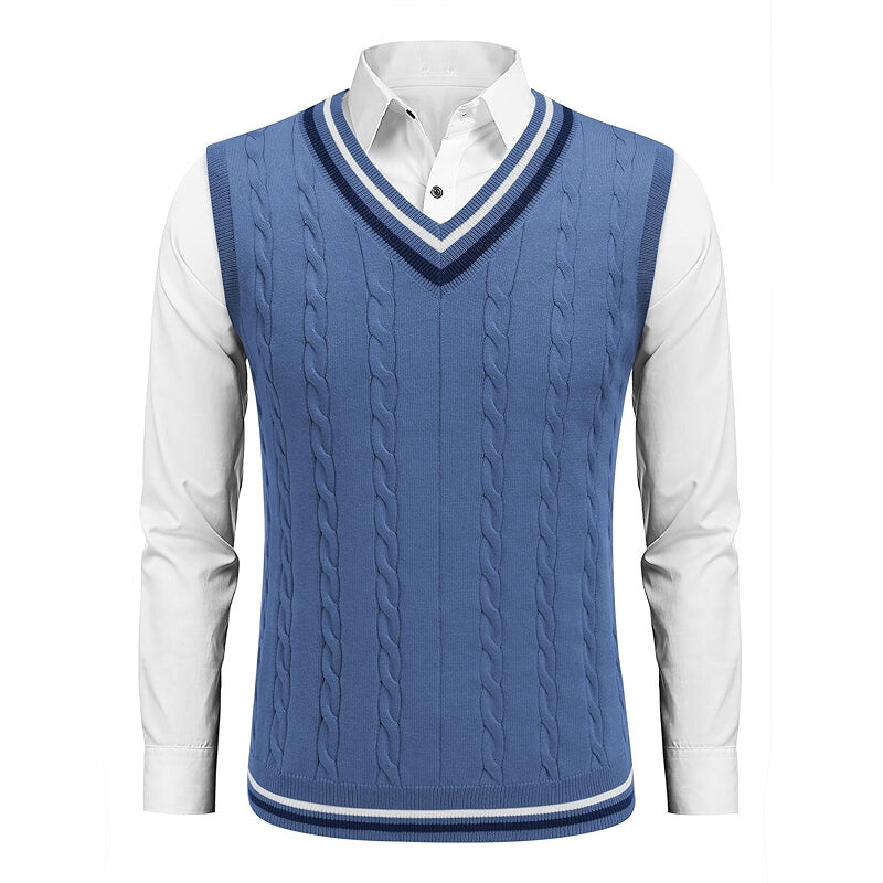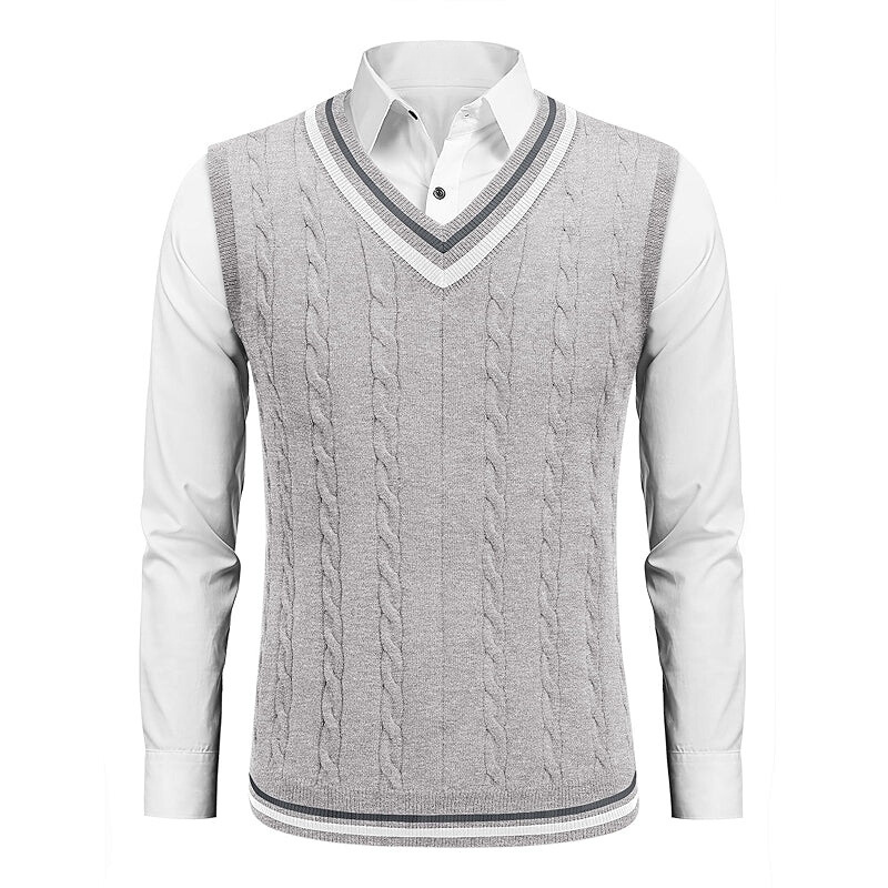 The Striped Trim Cable Knit Vest brings a stylish touch to any wardrobe while offering versatility. This sleeveless pullover serves as an ideal layering piece, easily worn over shirts or beneath jackets to suit various outfit combinations. Made from quality materials, it delivers a comfortable and appealing design, suitable for both casual and semi-formal occasions.