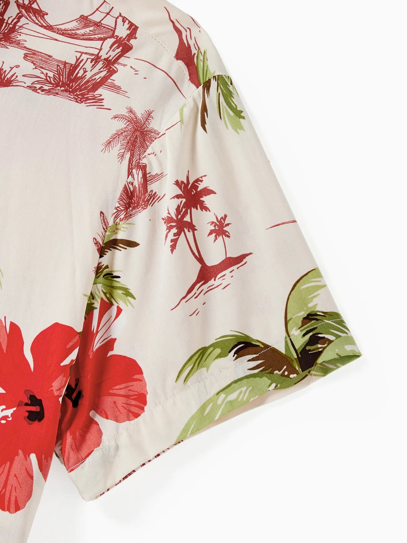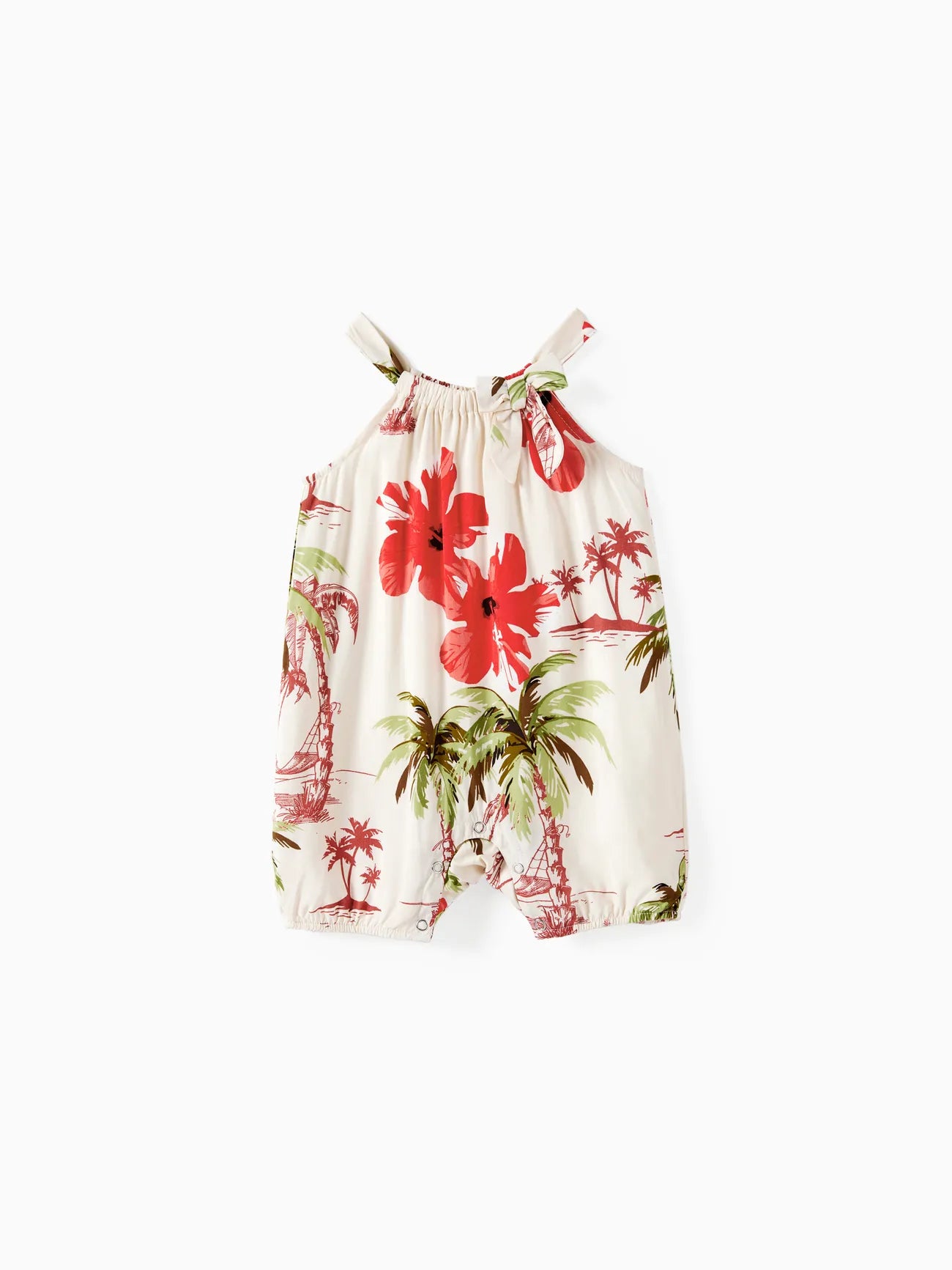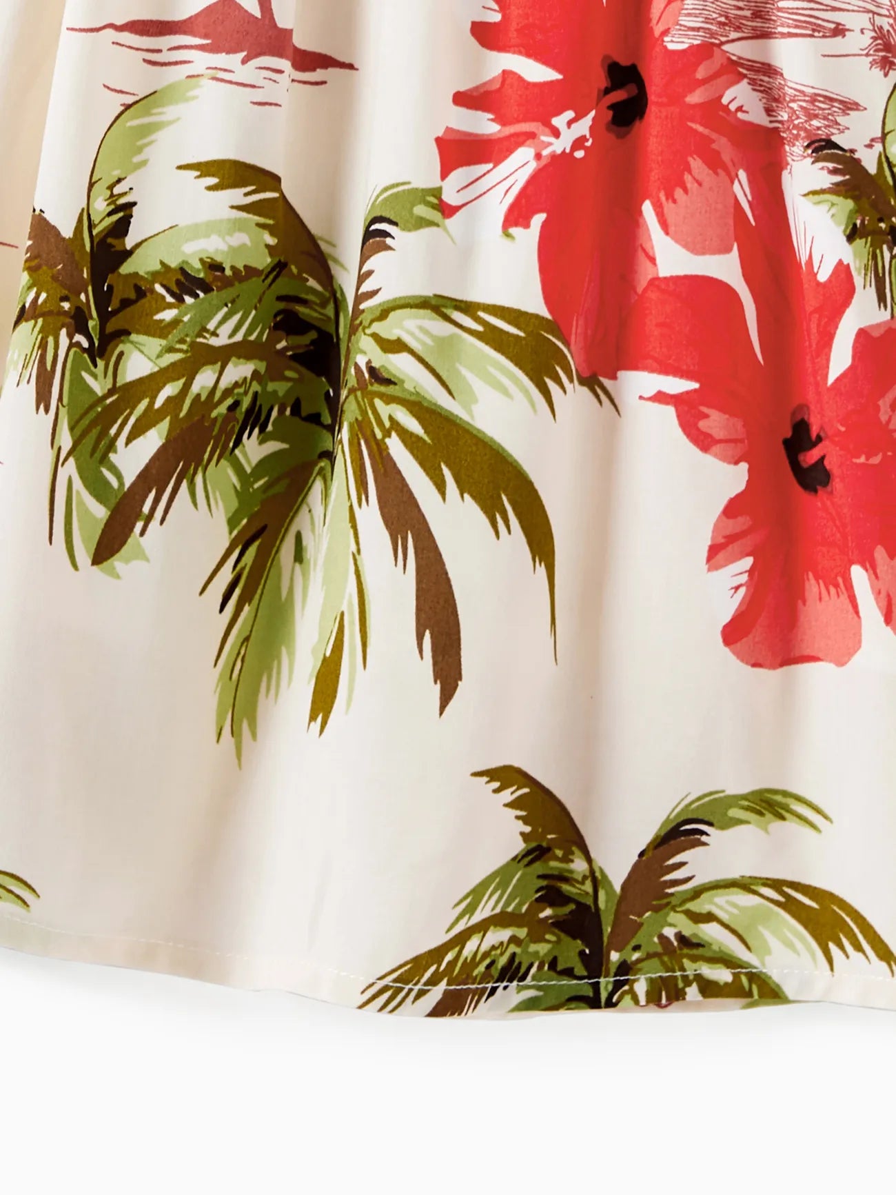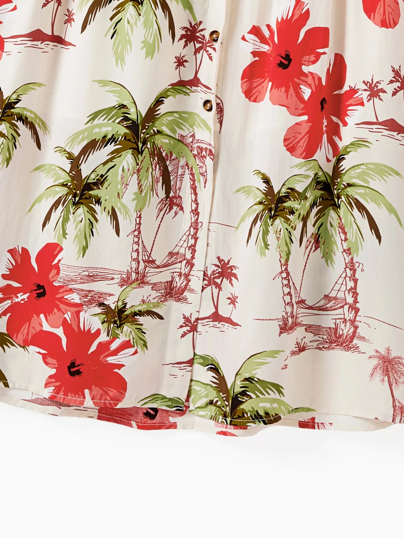 Design and Pattern: Each piece showcases a tropical print with palm trees and red hibiscus blooms on a light background, creating a comfortable, vacation-ready feel.