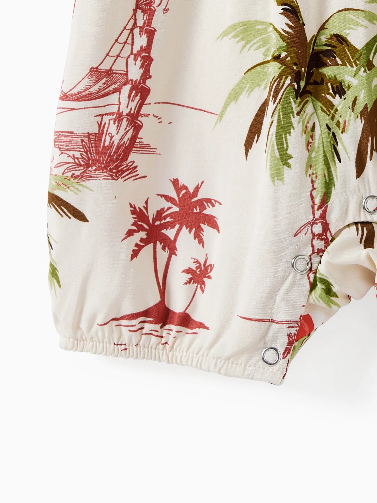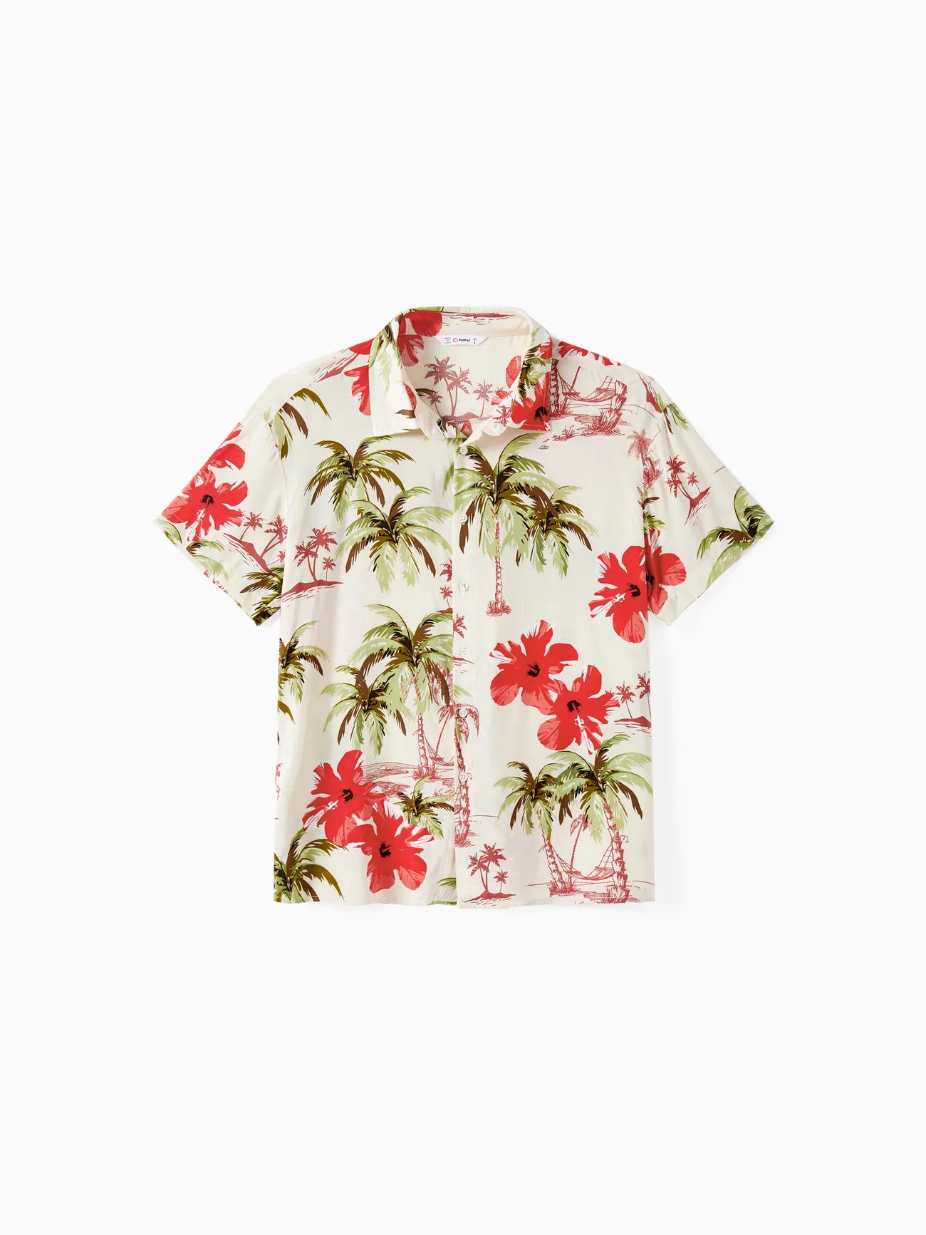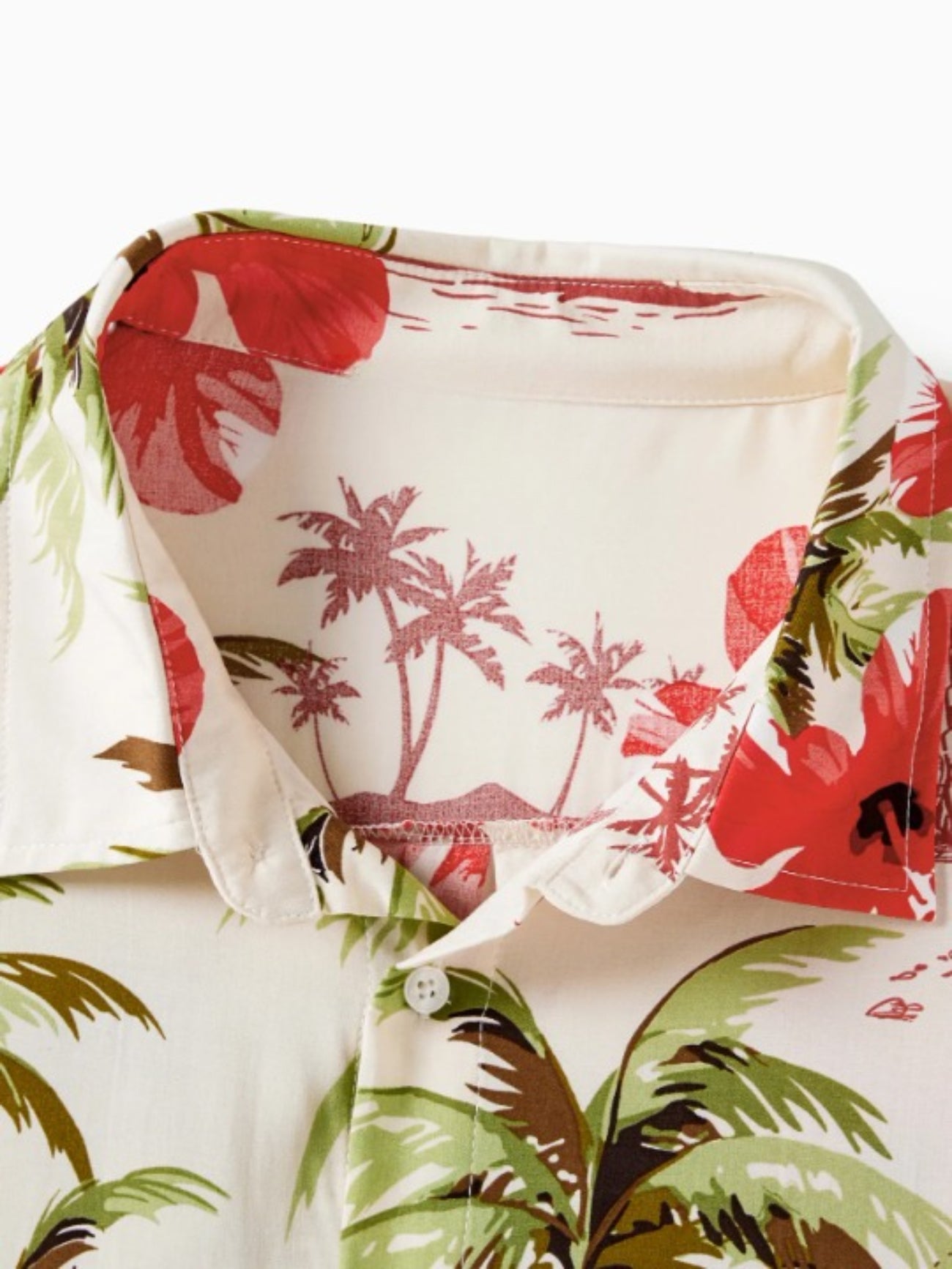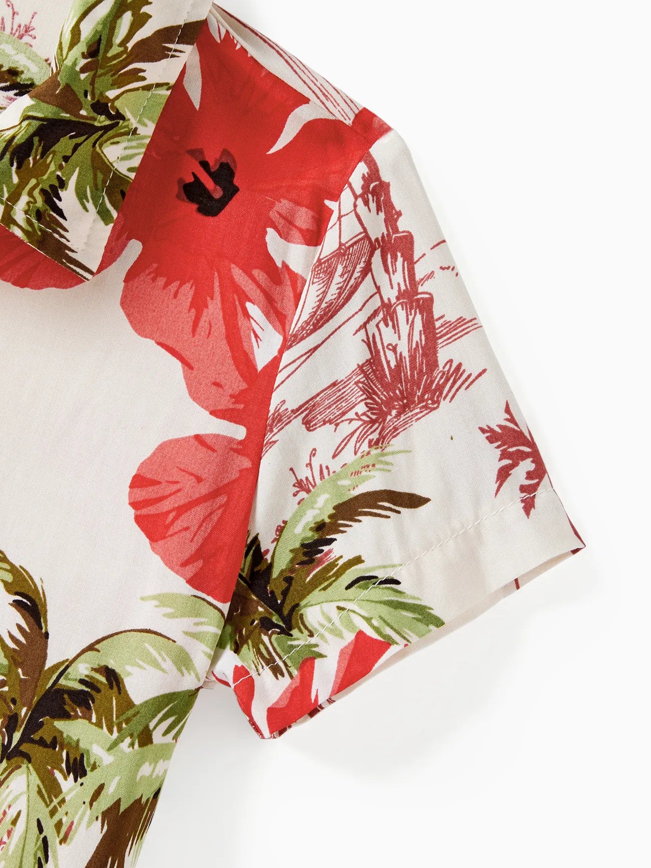 Design and Pattern: Each piece showcases a tropical print with palm trees and red hibiscus blooms on a light background, creating a comfortable, vacation-ready feel.