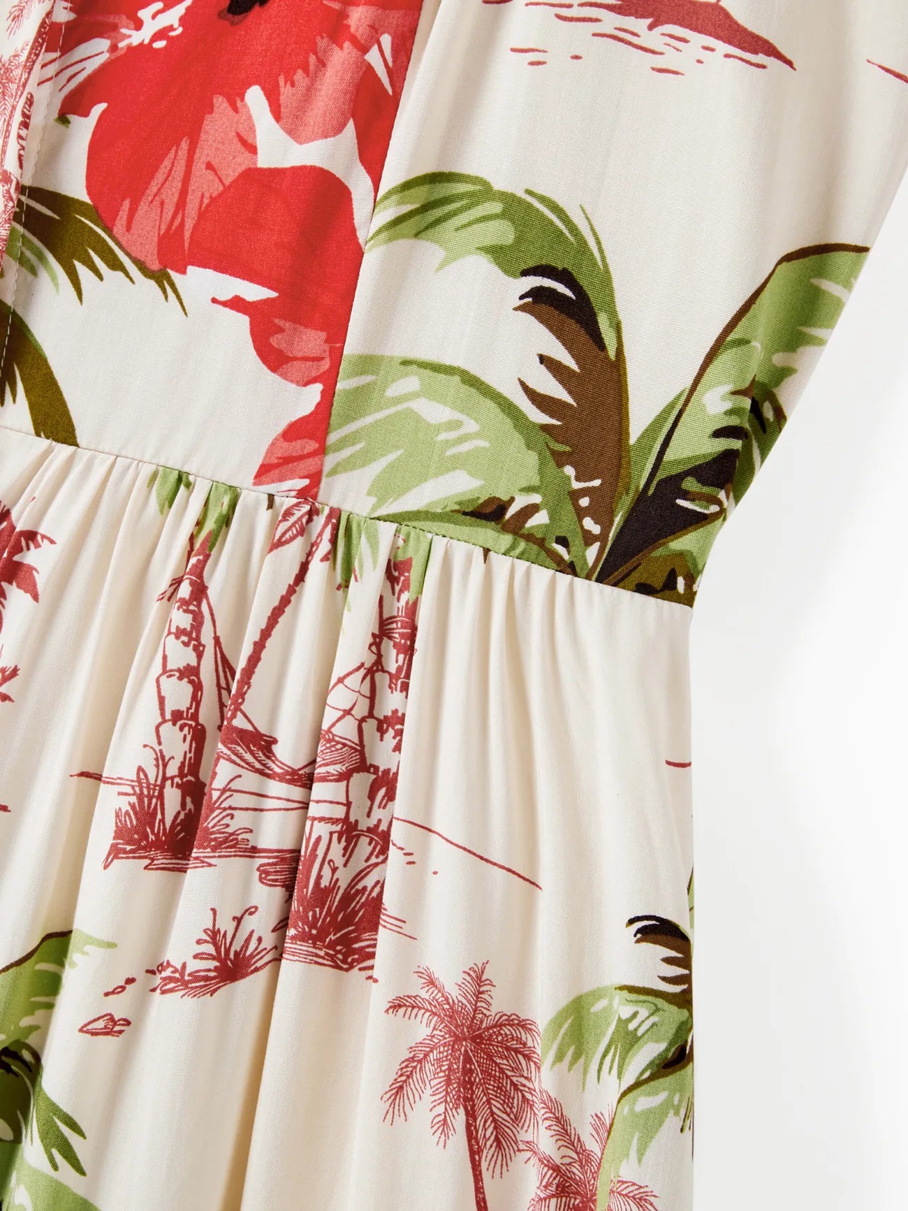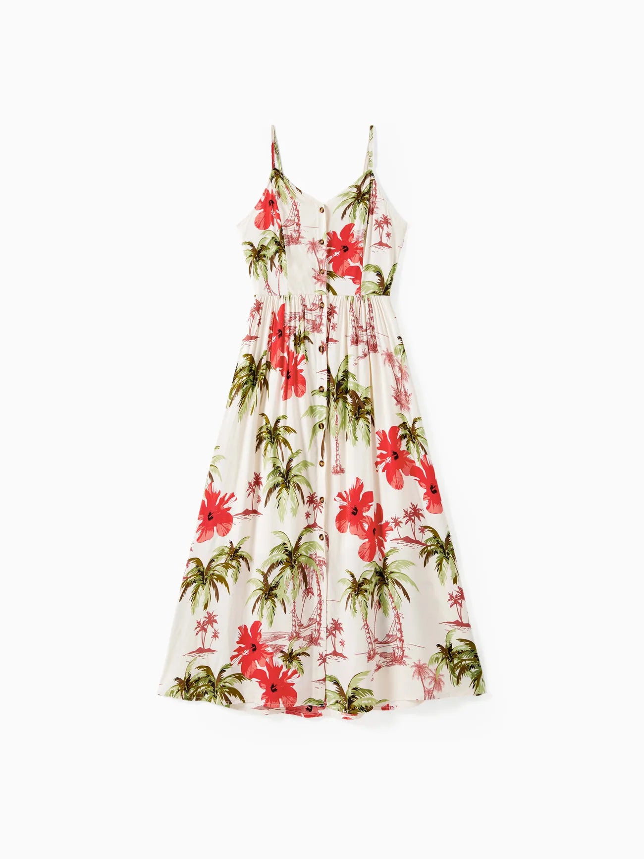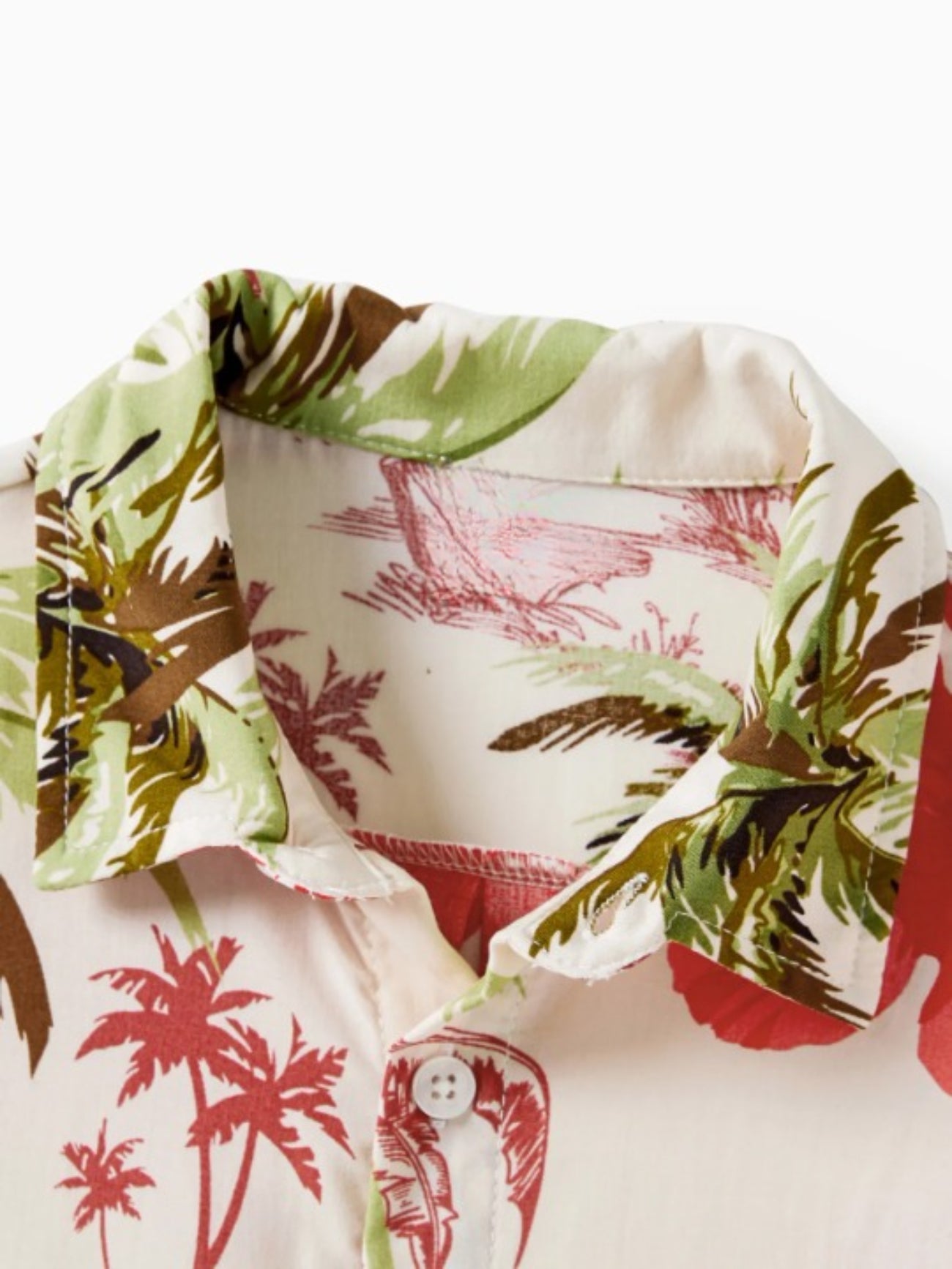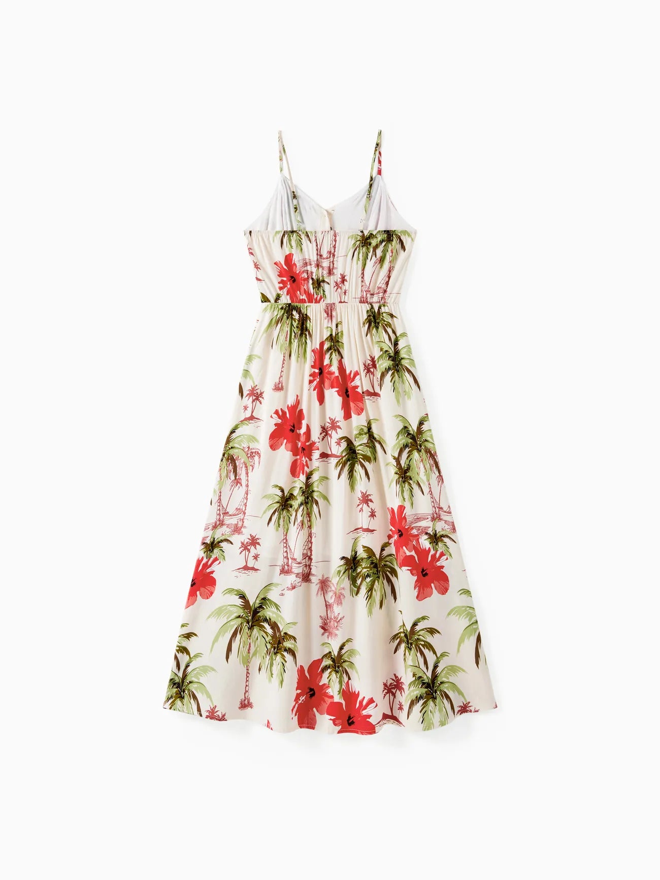 Design and Pattern: Each piece showcases a tropical print with palm trees and red hibiscus blooms on a light background, creating a comfortable, vacation-ready feel.