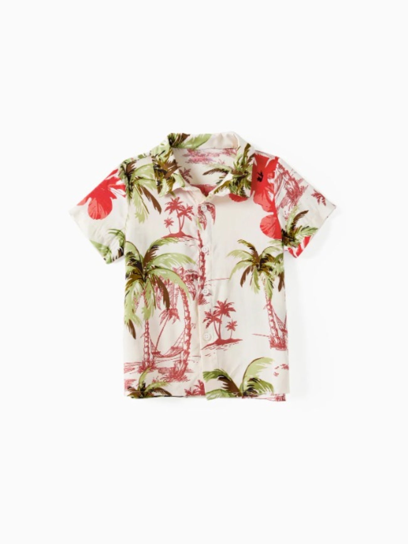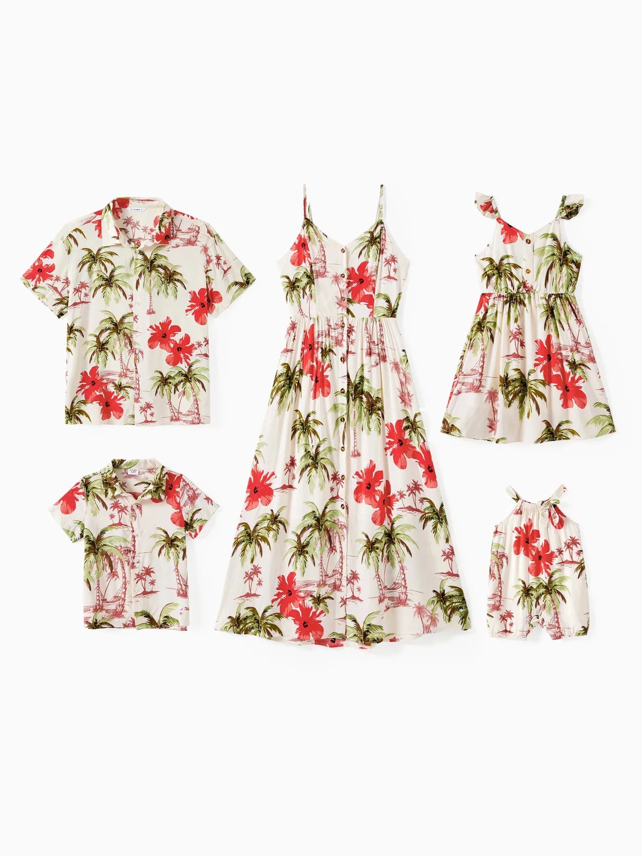 Introducing a vibrant collection of tropical-themed attire that infuses the spirit of island adventures into any family wardrobe. This set features various styles, each decorated with lively palm trees and hibiscus flowers, perfect for group outings or themed parties.