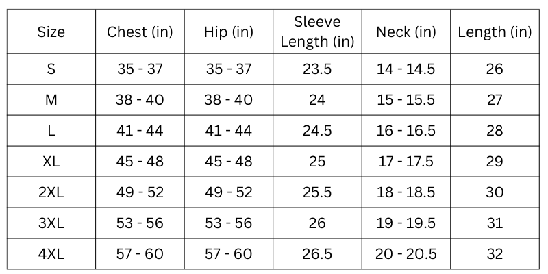 Size Chart (Inches):